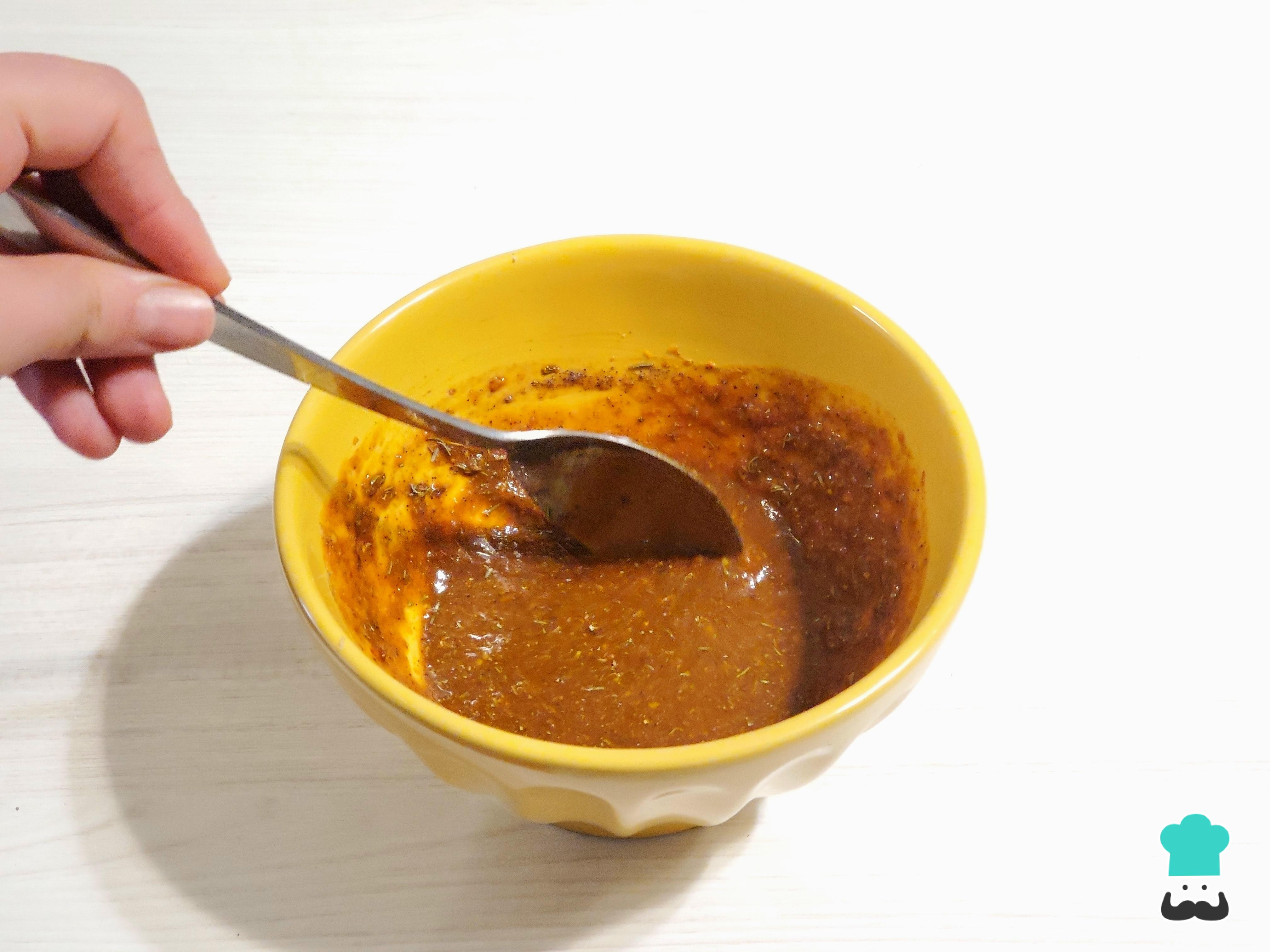 Para hacer este plato empezamos preparando el pollo al horno. En un bowl prepara el macerado mezclando la mostaza, ají panca en pasta, ajo molido, pimienta negra, sal, sillao, un chorrito de vinagre y las hierbas aromáticas: orégano y una pizca de tomillo. Remueve bien hasta integrar.