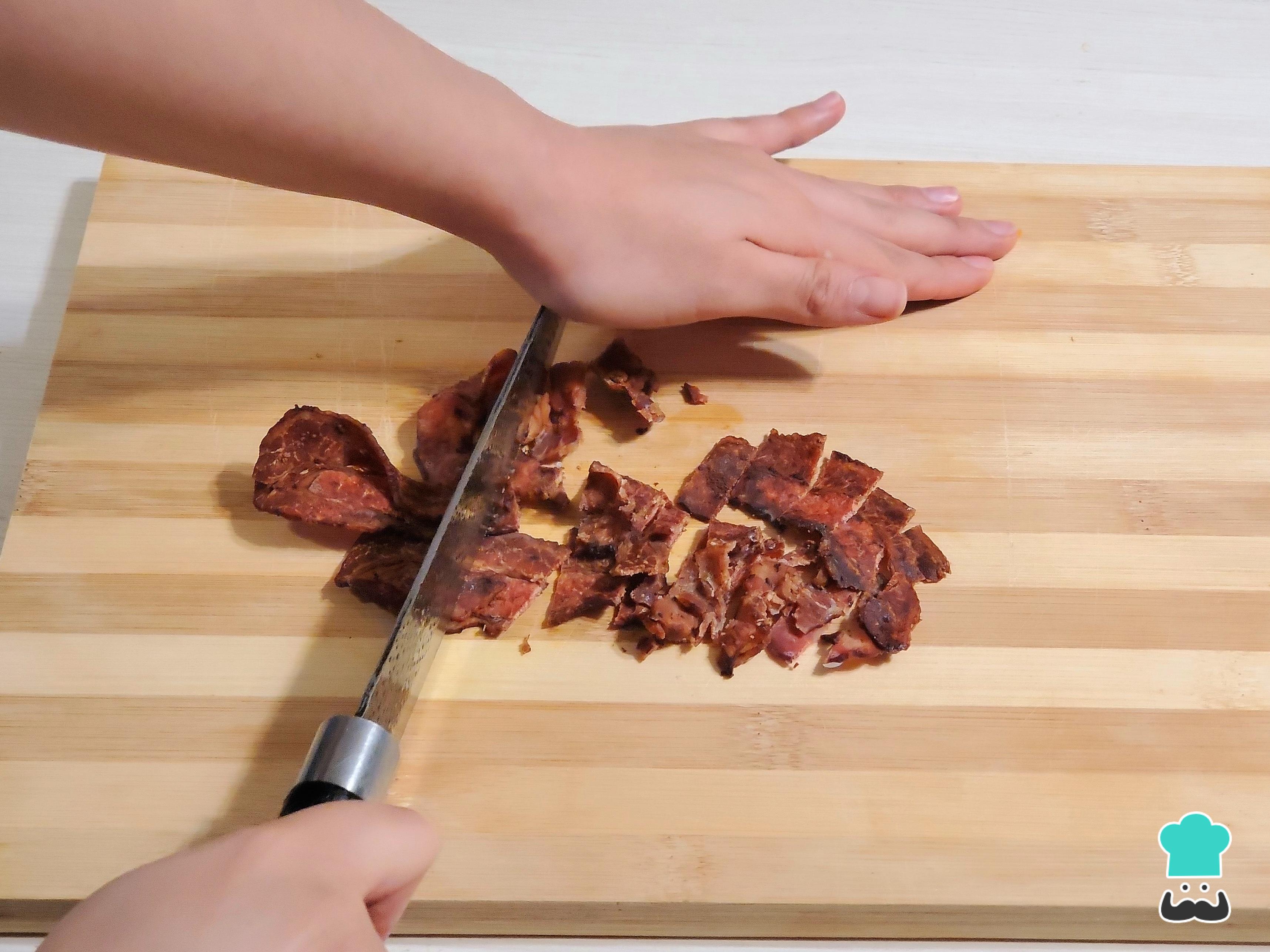 Para preparar el arroz árabe comienza dorando el tocino hasta que quede crujiente. Luego, córtalo en una tabla en trozos pequeños, no es necesario que sean regulares.