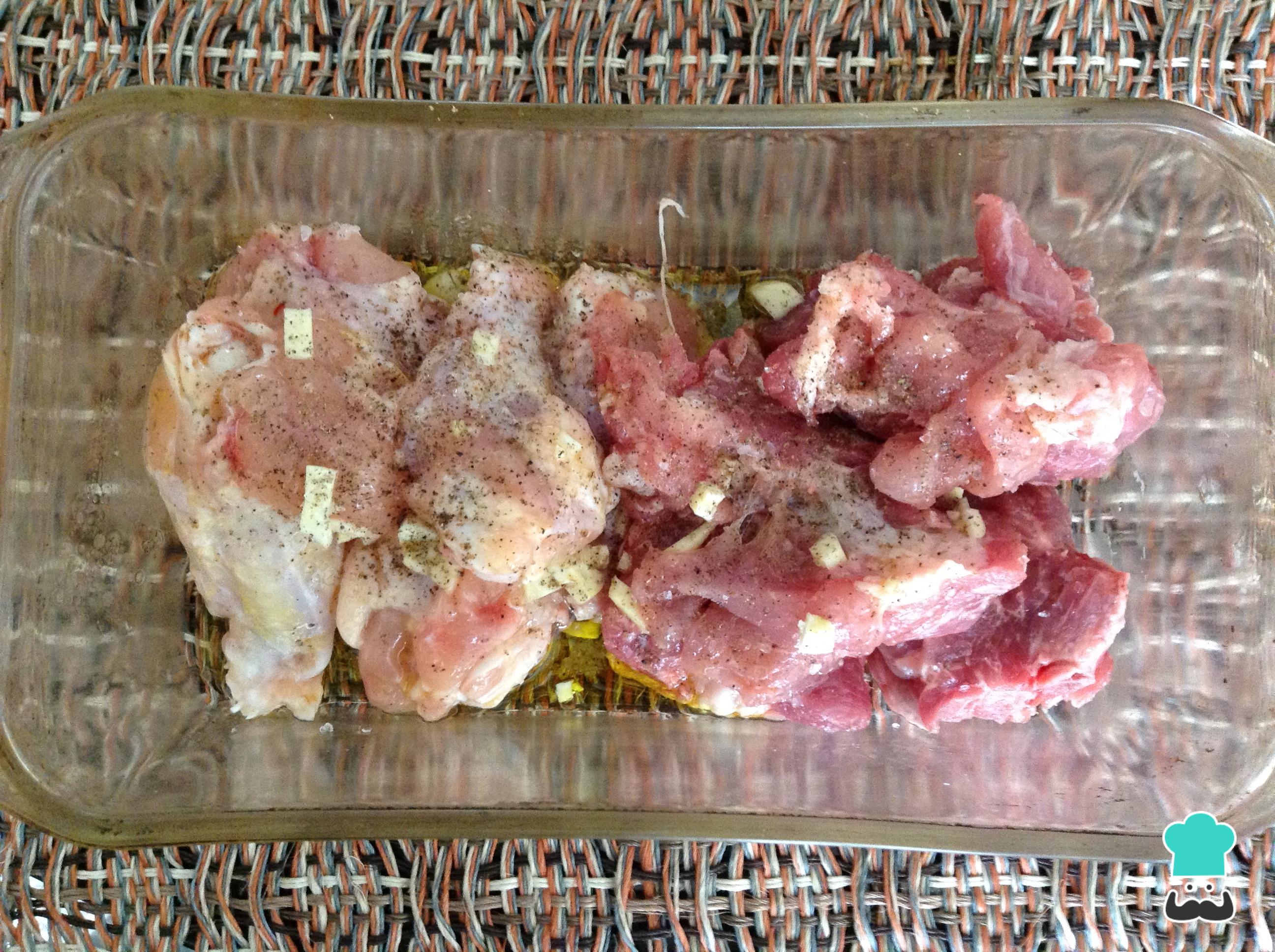 En una refractaria adicionar las colombinas de pollo y las costillas de cerdo, agregar dos cucharadas de aceite de oliva, los ajos finamente picados, sal y pimienta al gusto.Llevar al horno durante unos 30 minutos a 160 grados centígrados.