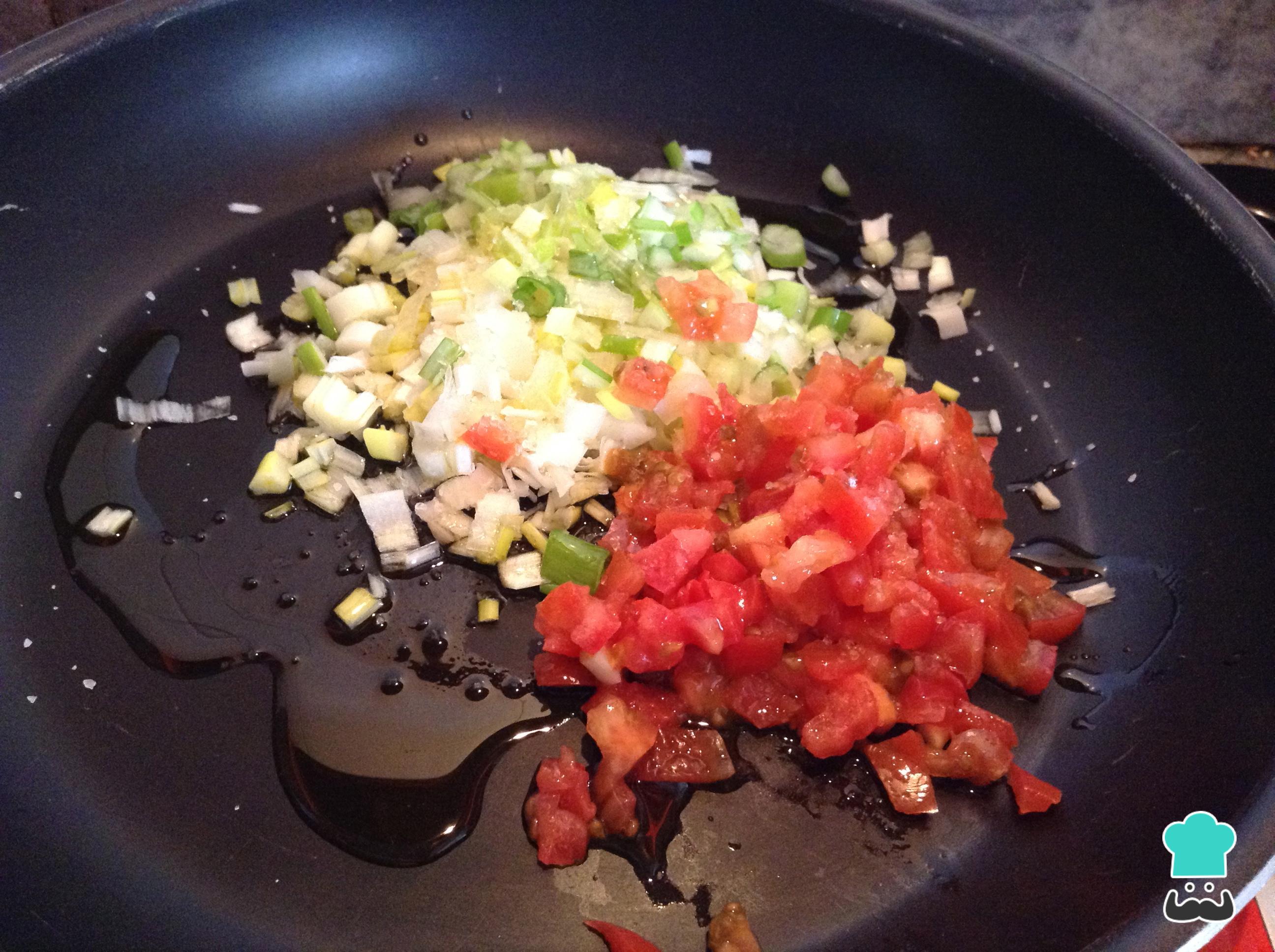 Mientras nuestras carnes están en el horno debemos lavar y picar nuestra cebolla larga o de verdeo y los tomates.Llevar a un sartén con un poco de aceite de oliva y sofreír muy bien durante uno diez minutos para hacer la base de nuestro arroz atollado.
