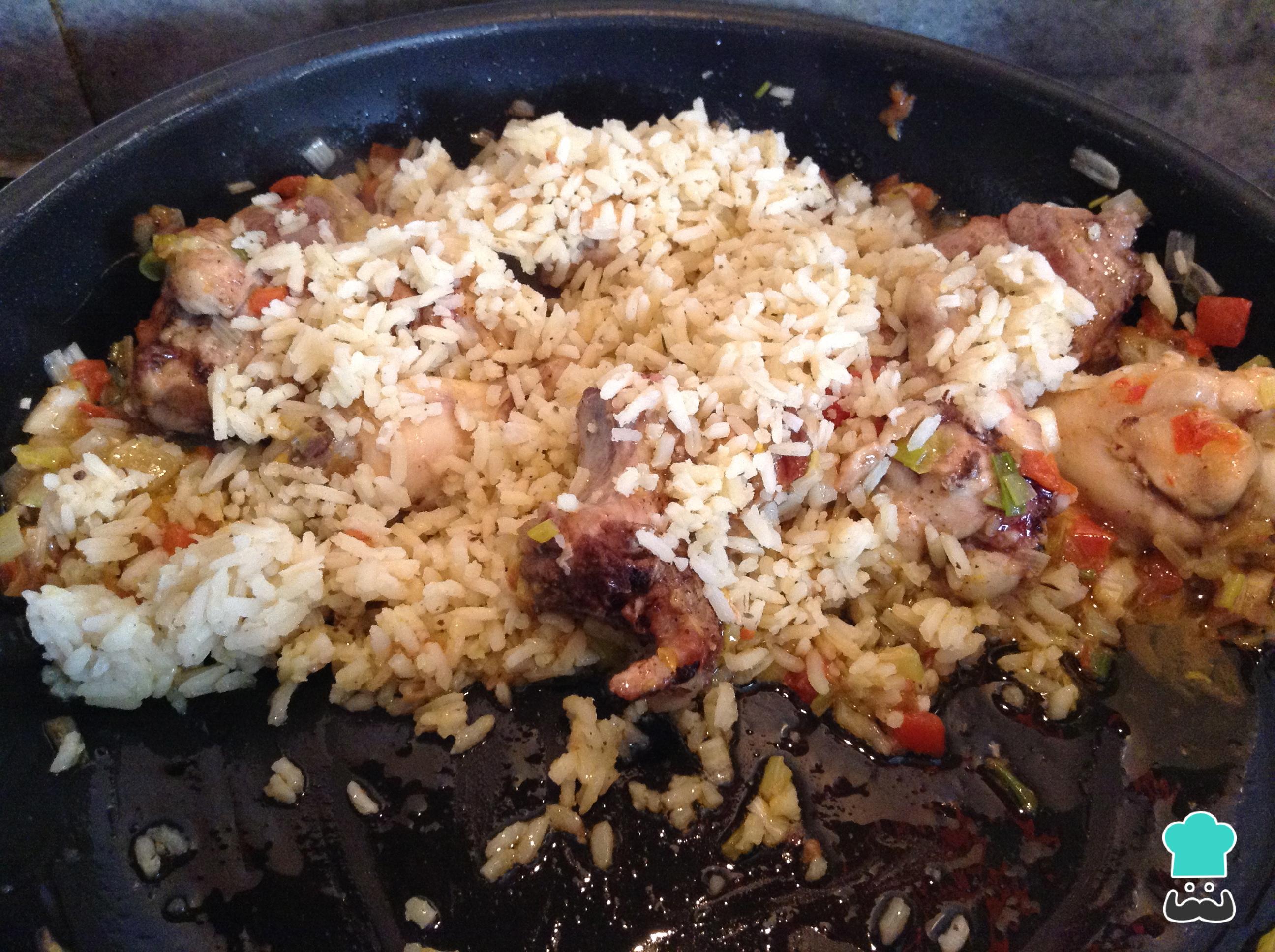 Adicionar el arroz blanco y mezclar bien para integrar los ingredientes del arroz atollado, si ven que nuestra preparación tiene más grasa de los normal podemos retirar con mucho cuidado la grasa o desgrasar como se usa en el mundo culinario para que nuestros arroz atollado no quede cargado de grasa.Apagar el fuego.