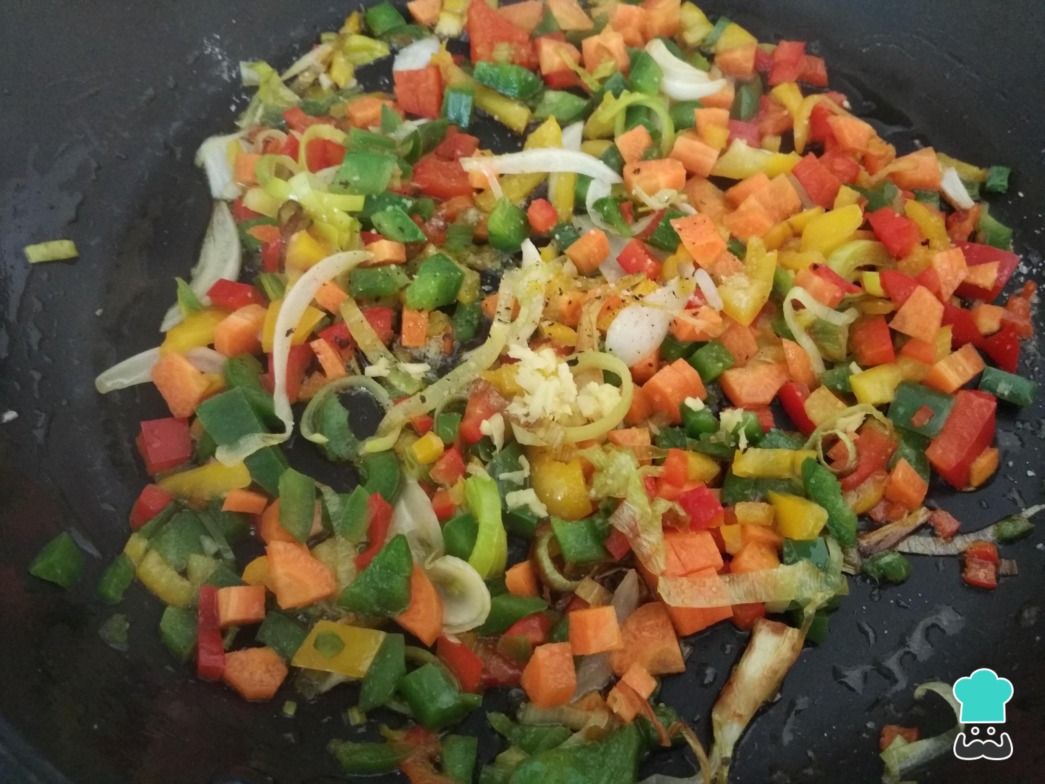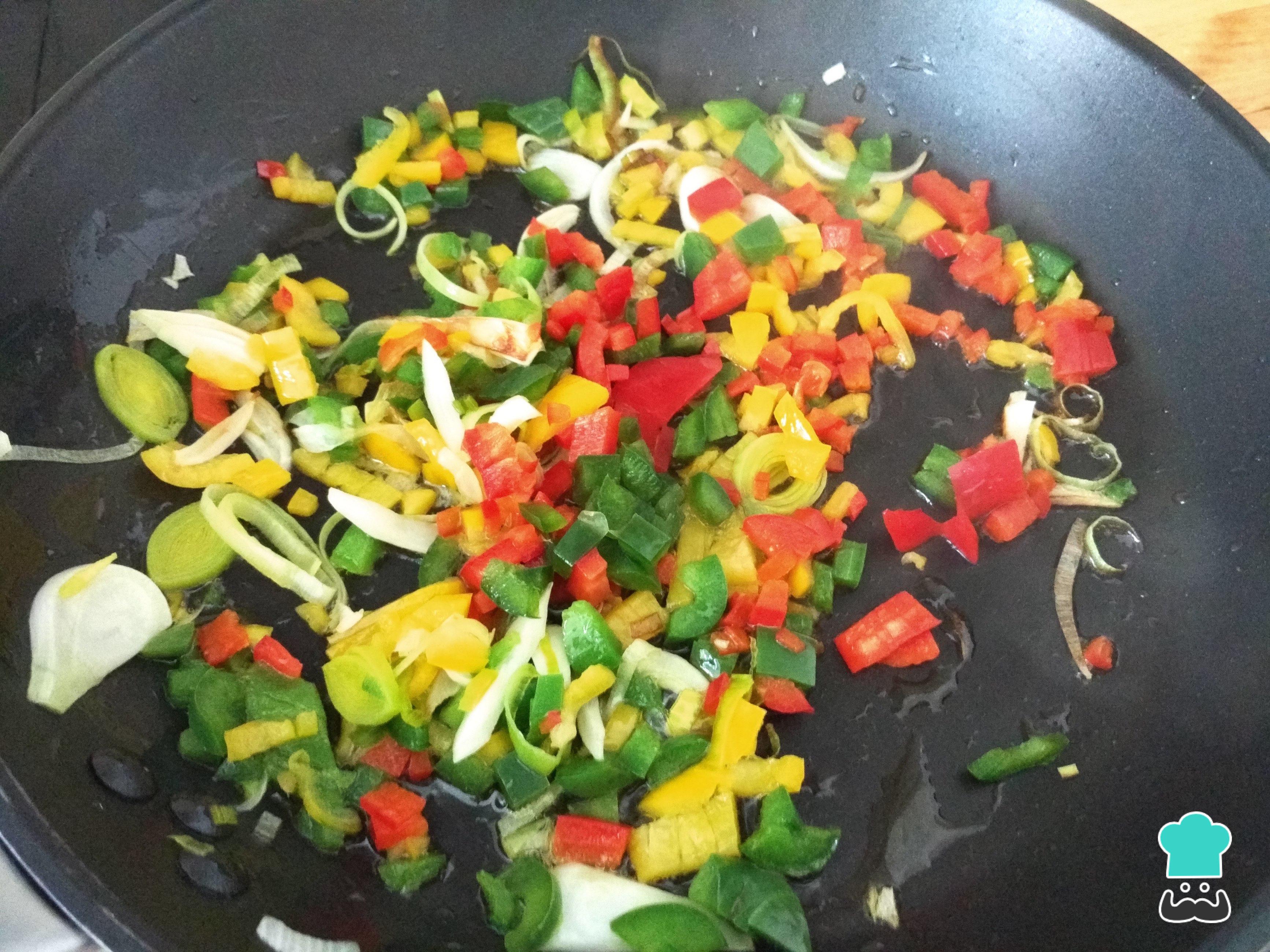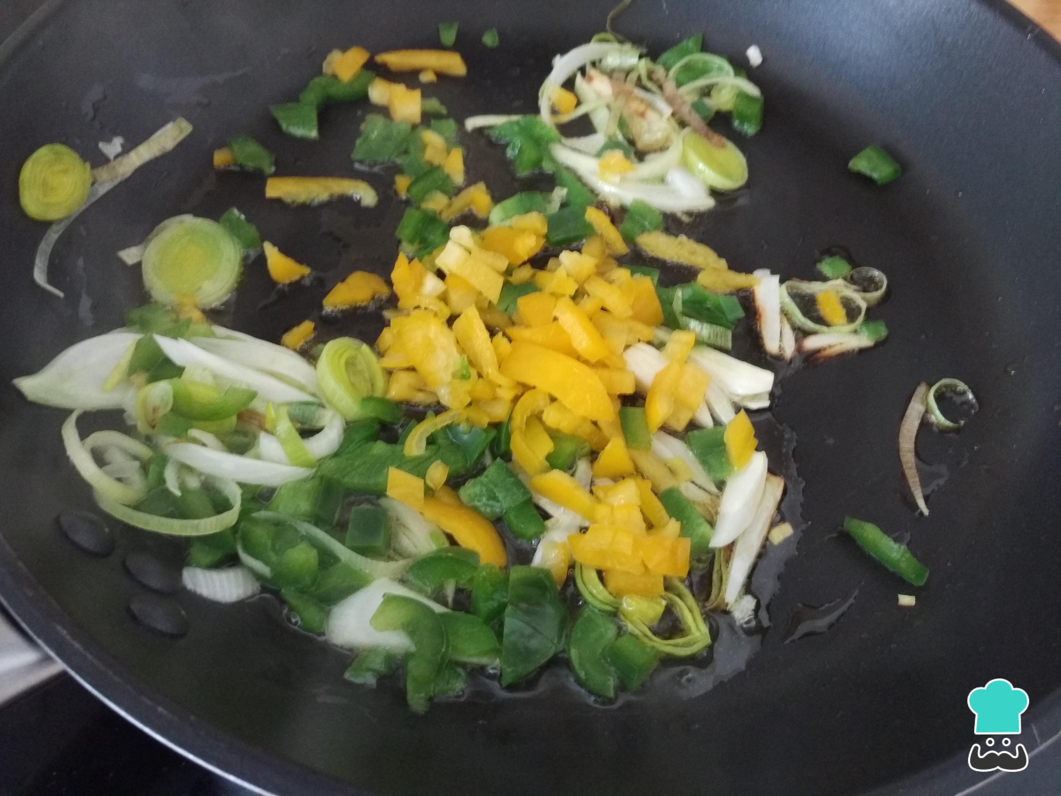 Por una parte, hacemos un sofrito con el puerro picado y el pimiento verde y amarillo cortados en cuadraditos.