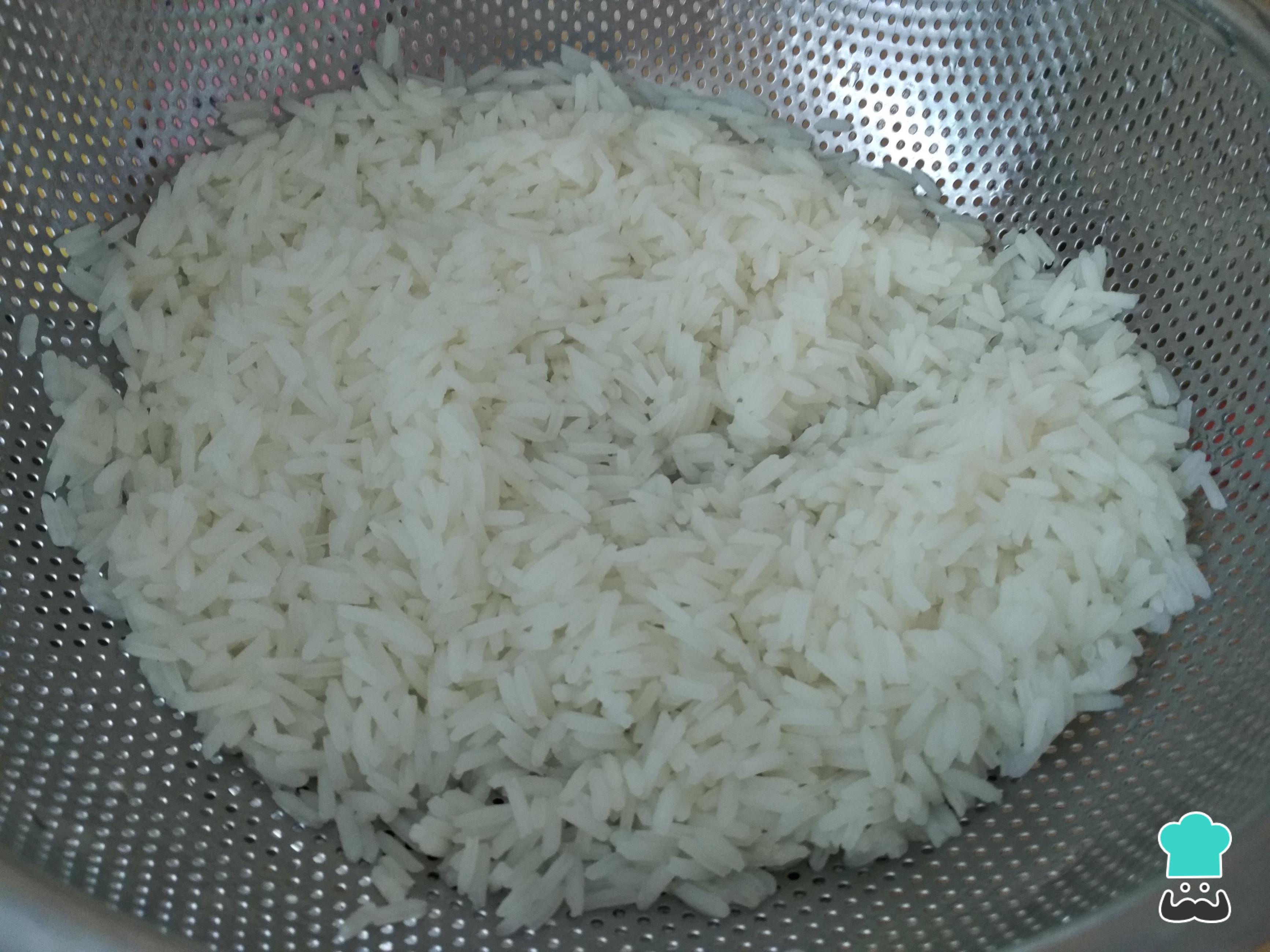Por otra parte, cocemos el arroz basmati en abundante agua hirviendo con un poco de sal y una hoja de laurel. Pasado el tiempo de cocción, colamos el arroz y reservamos.