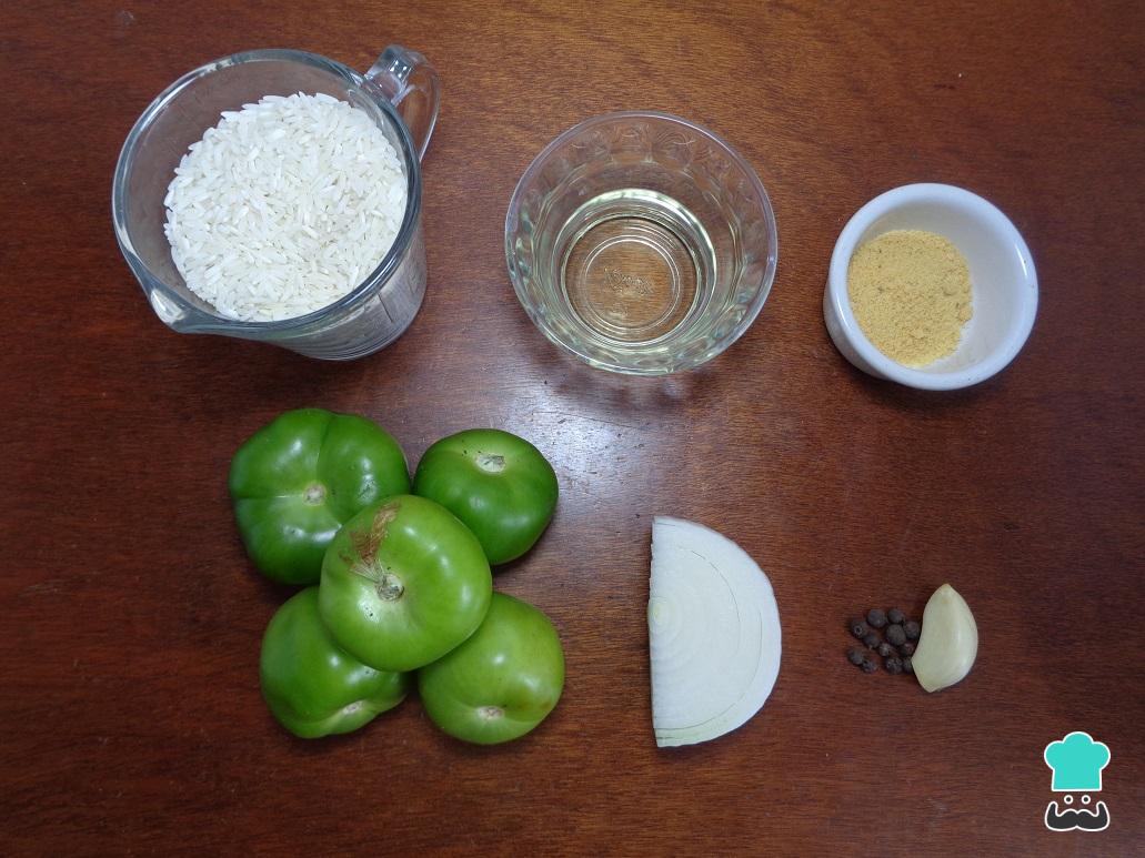 En la siguiente imagen podrás observar los ingredientes que necesitaremos para la preparacion de este delicioso arroz blanco con tomate verde, no pierdas detalles.