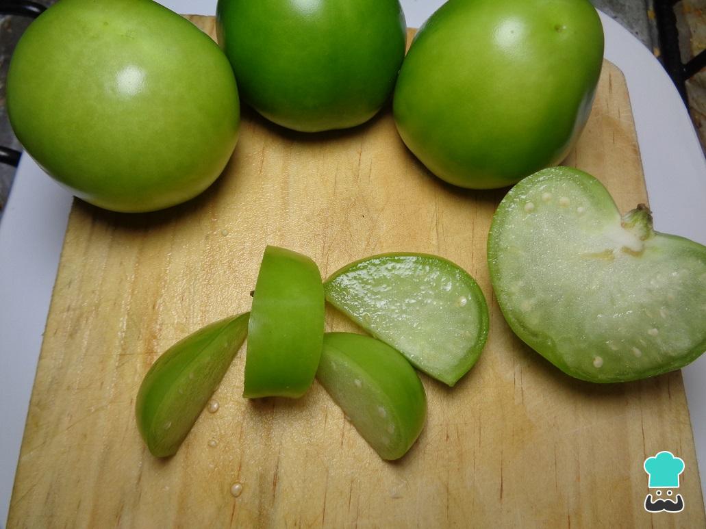 Vamos a comenzar esta receta mexicana lavando perfectamente bien los tomates verdes y posteriormente los rebanamos en pequeños trozos como podemos ver en la siguiente imagen. Una vez listos los reservamos un momento.