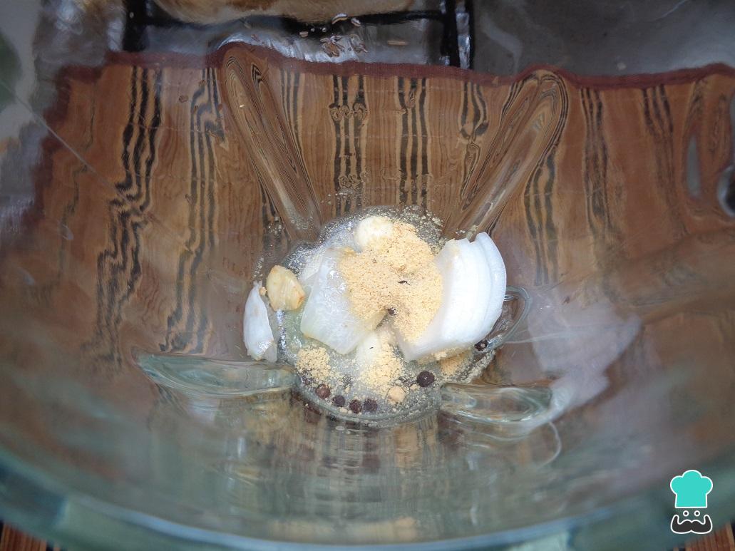Mientras tanto colocamos en la licuadora el agua, la cebolla, el ajo, la pimienta en grano y el consomé de pollo en polvo, y procedemos a licuar hasta obtener una mezcla homogénea para el arroz verde. Reservamos un momento.