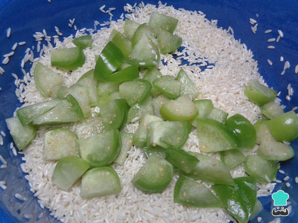 Cuando el arroz se observe medio dorado agregamos los trozos de tomate verde y dejamos que se frían el resto de tiempo junto con el arroz.