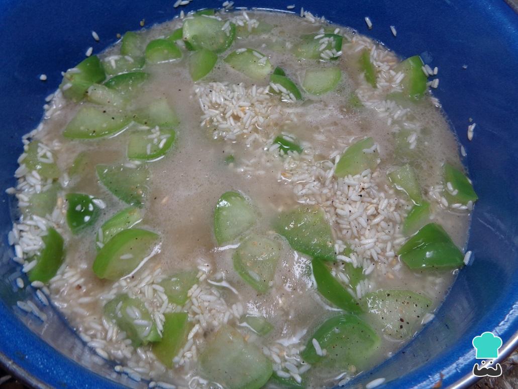 Una vez el arroz esté dorado, tomamos la mezcla de condimentos que hace un momento licuamos, la vertemos sobre el arroz, y removemos para incorporar perfectamente bien todo. Tapamos la cacerola para que se cueza el arroz y lo cocinamos a fuego medio por aproximadamente 15 minutos. Removemos de vez en vez para evitar que el arroz con salsa de tomate verde se pegue a la olla o se queme, aunque no movemos mucho para evitar que el arroz se bata.