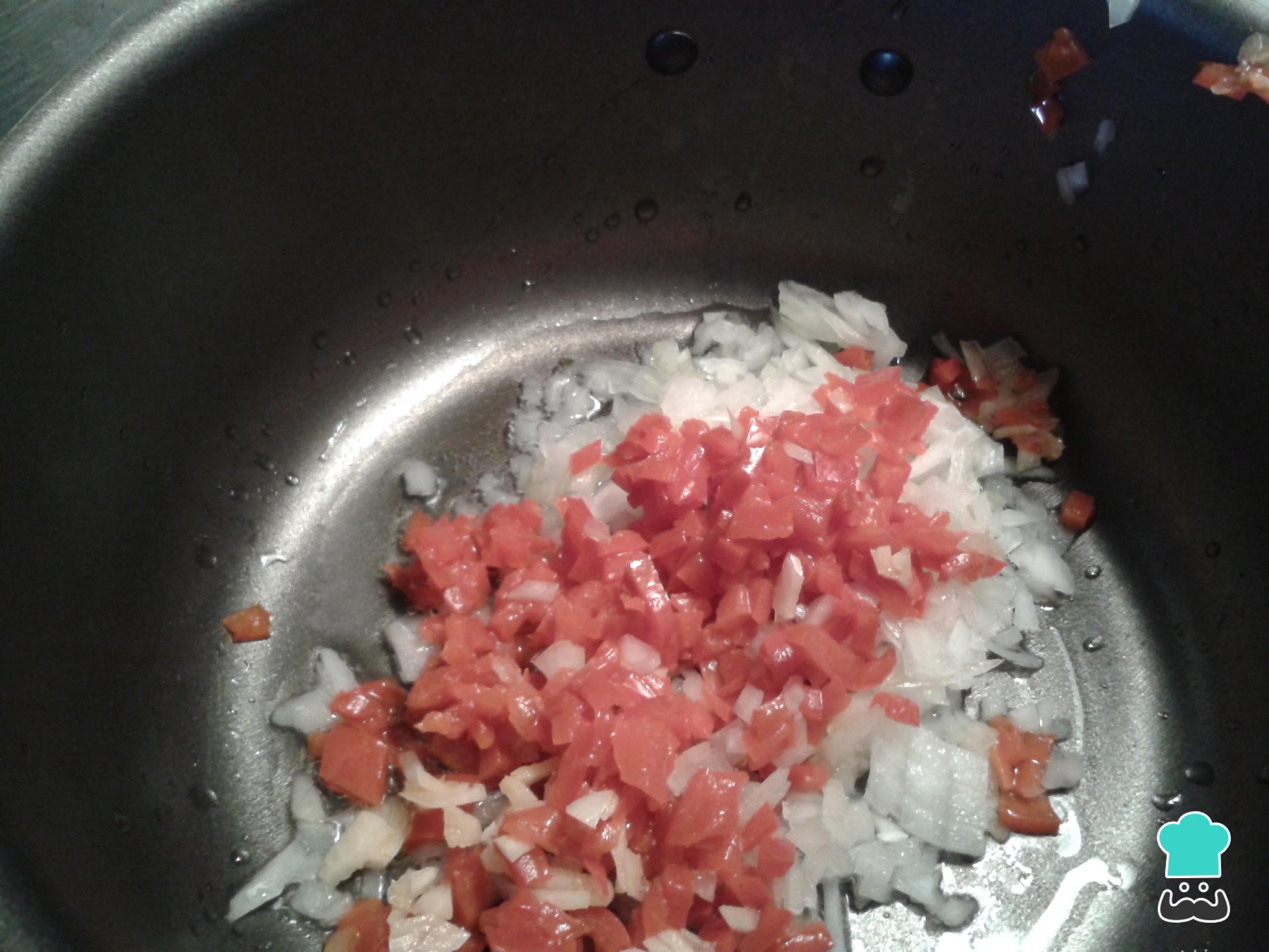 Cortamos el pimiento y la cebolla en cubos pequeños, el ajo picarlo finamente y poner a sofreír todo a fuego medio.
