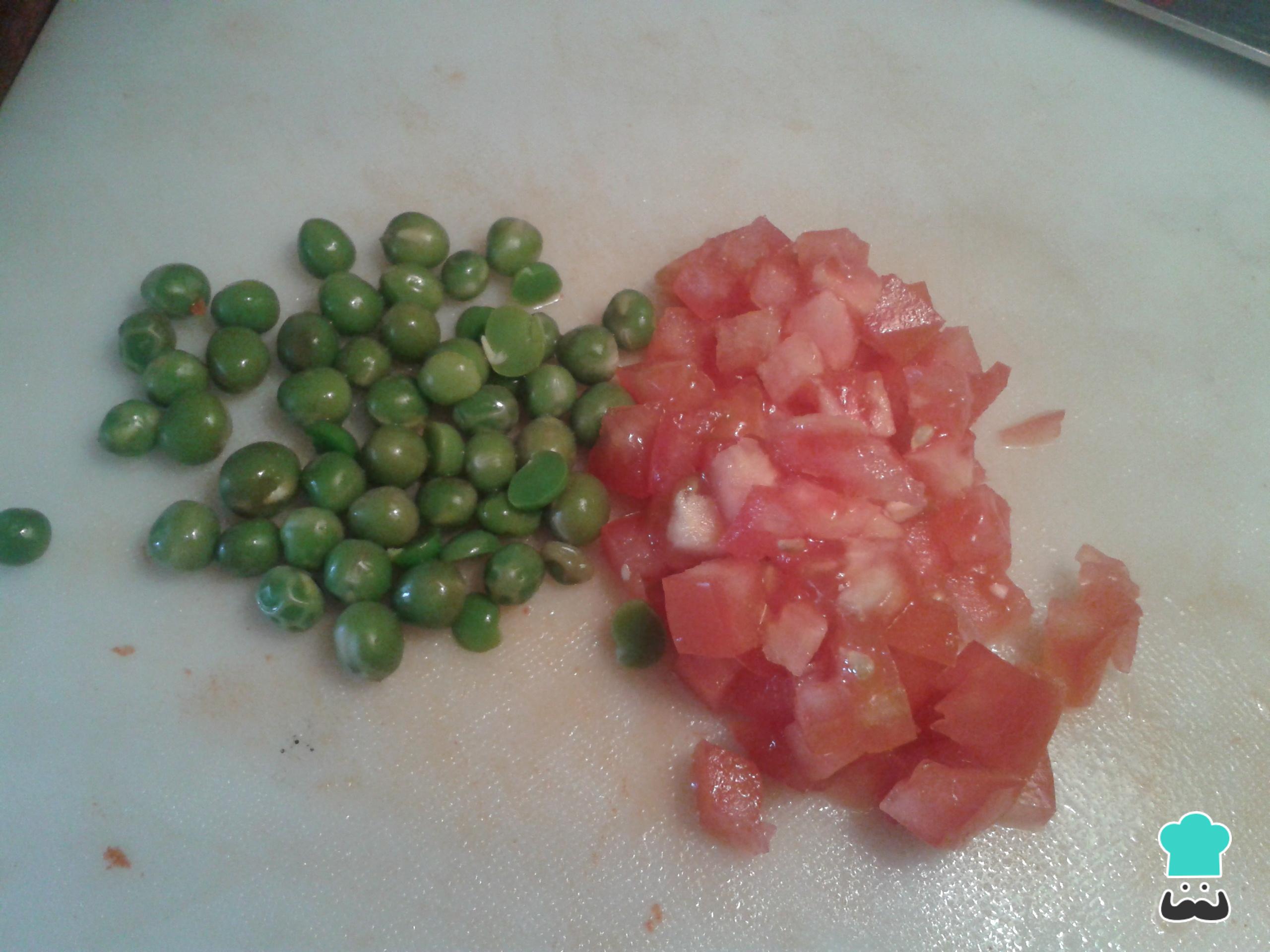 Pelamos y cortamos el tomate en cubos pequeños. Lavamos y dejamos lista la arveja.