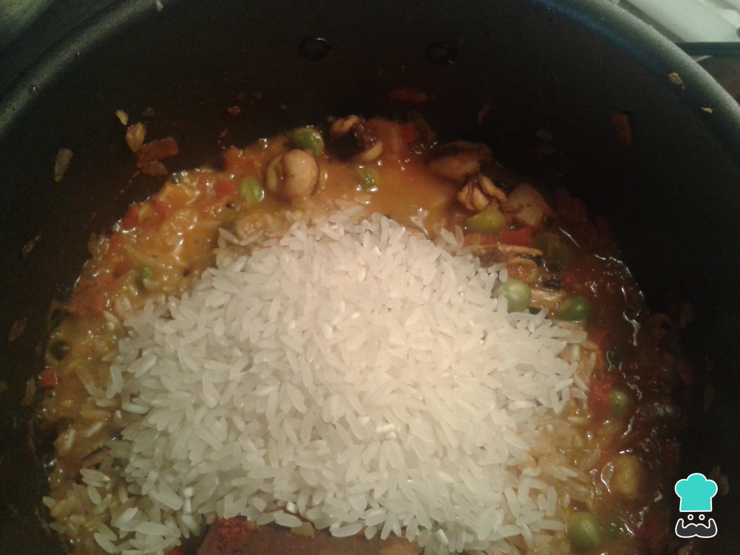 A medida que el arroz se vaya secando iremos agregando agua o más caldo, también deberás ir corrigiendo de sal durante la cocción, con mucho cuidado de no salar el arroz.