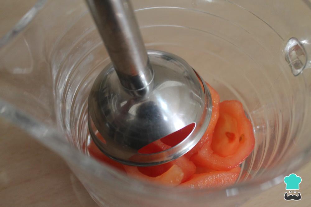 Lava y pela los tomates, trocéalos y retira las semillas. Pon los tomates troceados en el vaso de la batidora y tritúralos. Reserva.