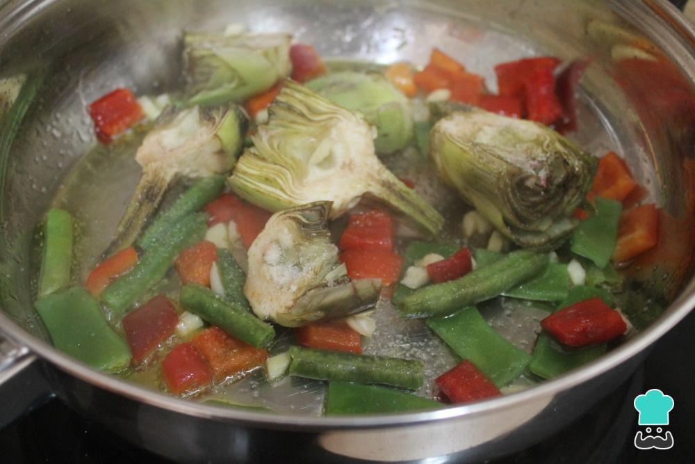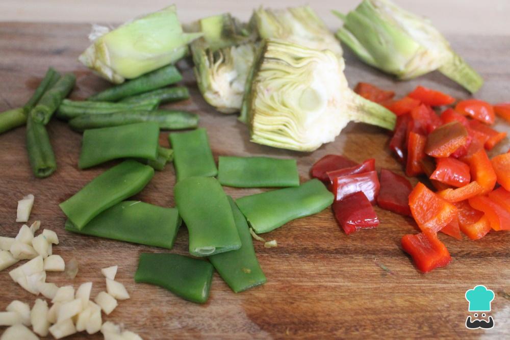 Prepara el resto de verduras, de manera que lava las judías verdes y córtalas en trocitos desechando las puntas. Lava los pimientos, retira las semillas y córtalo en trocitos. Pela los dientes de ajo y pícalos. Retira las hojas exteriores y más duras de las alcachofas. Corta también la parte de abajo de las alcachofas, deja la parte más tierna, córtala por la mitad y quita los pelitos del interior en el caso de que los tuviera.