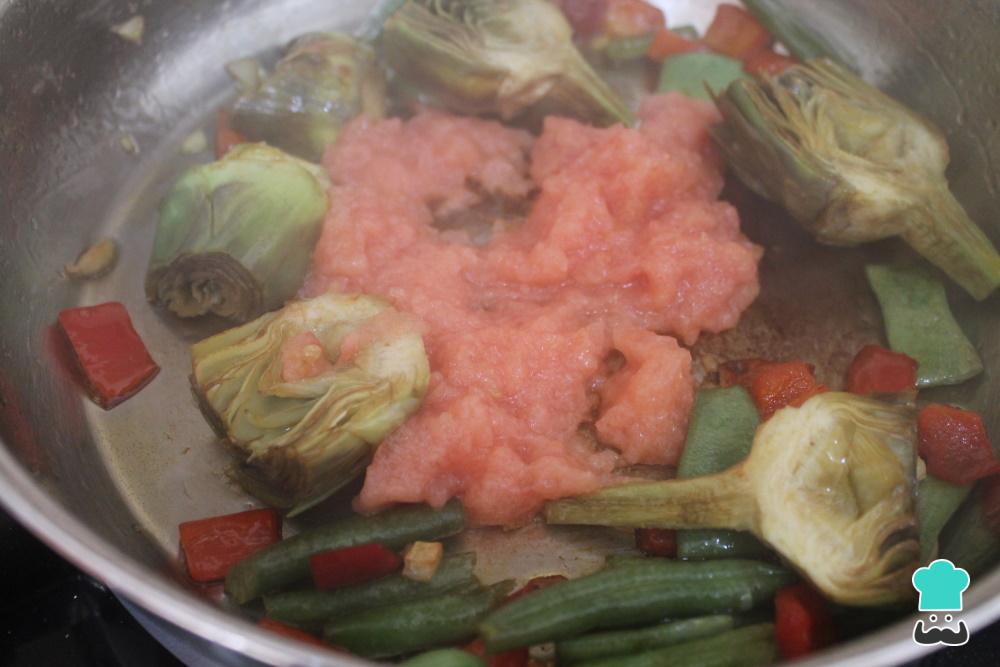 Incorpora el tomate triturado y sorfríe todo junto durante unos 3 minutos, removiendo de vez en cuando. El arroz caldoso con verduras queda mucho mejor si usas tomate triturado natural, pero si en estos momentos no dispones de tomates, puedes usar tomate triturado de bote.