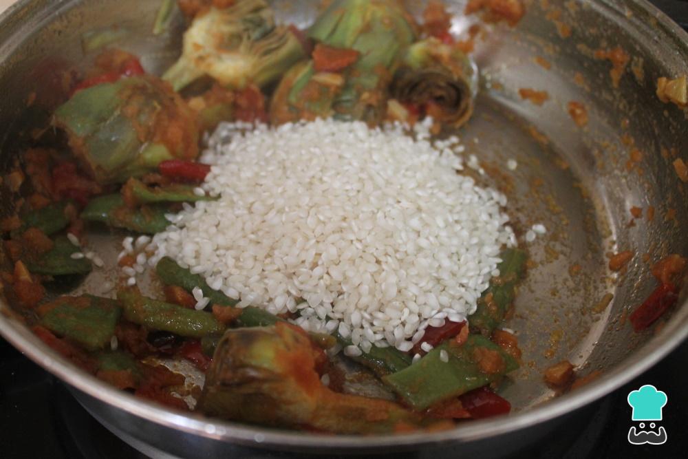 Añade el arroz y remueve para que se impregne de los sabores del sofrito durante 2 minutos, mezclando continuamente.