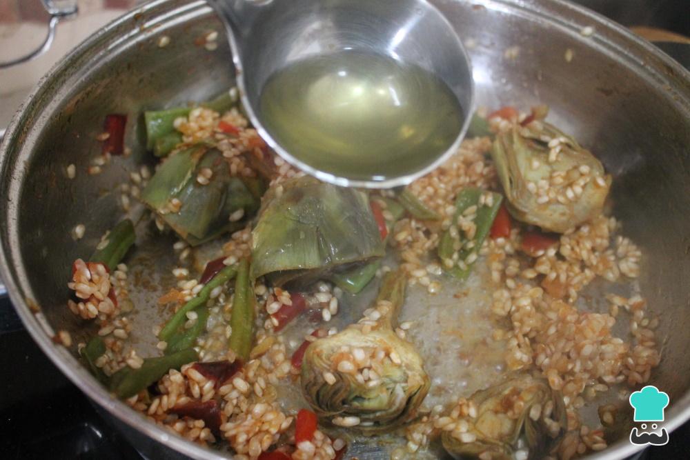 Mientras estás con el sofrito, pon a calentar el caldo vegetal hasta que hierva y agrégalo poco a poco a la olla con las verduras y el arroz. Remueve. Utiliza preferiblemente un caldo de verduras casero.