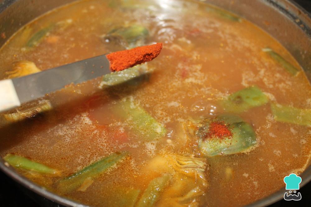 Incorpora a la olla una cucharadita de pimentón y una pizca de cúrcuma. Puedes añadir más o menos cúrcuma en función del color que quieras que tenga tu arroz caldoso con verduras. Luego, cubre la cazuela con una tapa y deja que se cueza durante 18 minutos.