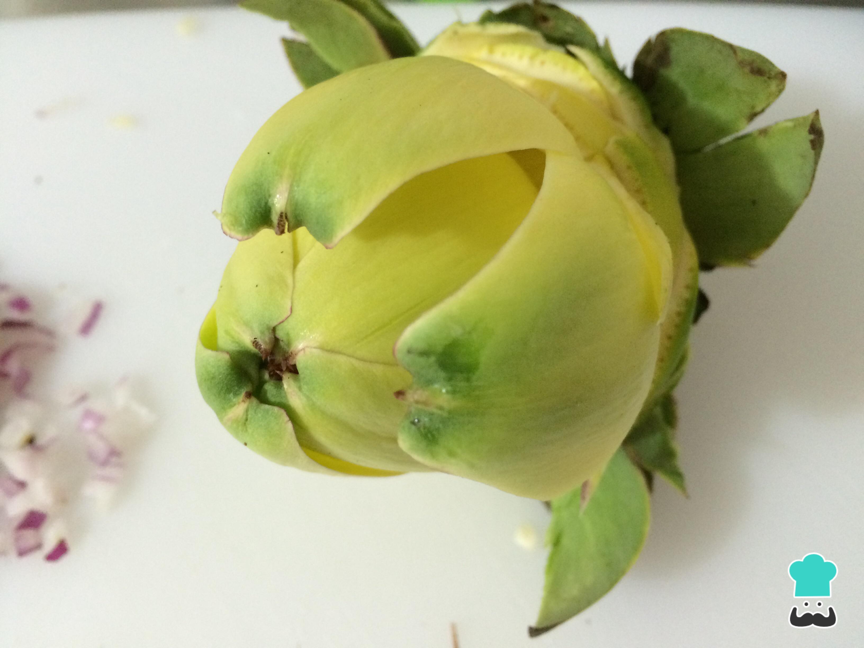 Deshojar las alcachofas y retirar la pelusilla del corazón, cortar el corazón en trozos pequeños y la parte más blanda de algunas hojas.