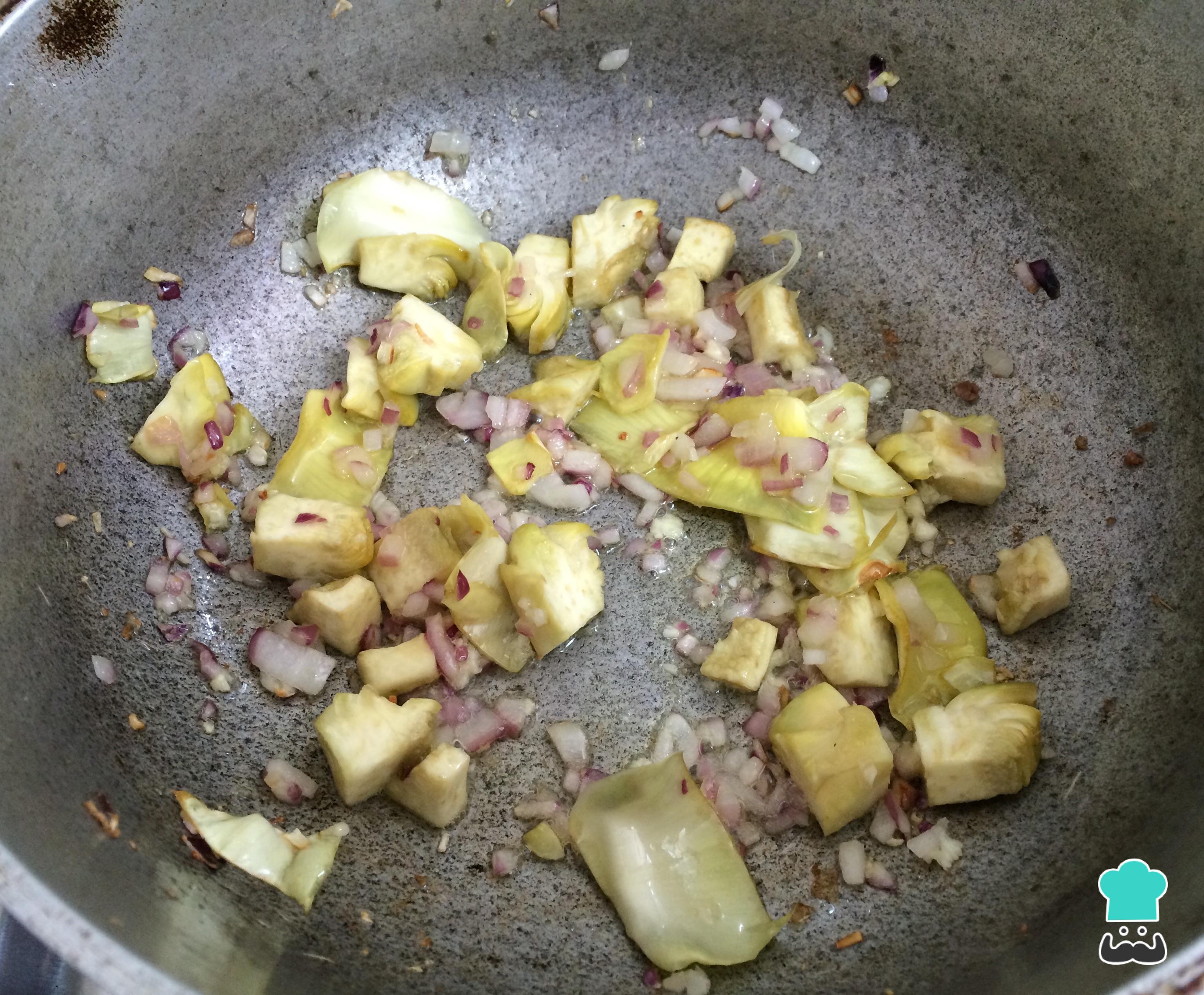 En una olla con aceite agregar las alcachofas, la cebolla y el ajo finamente picados. Sofreír durante 5 minutos a fuego bajo, salpimentar.