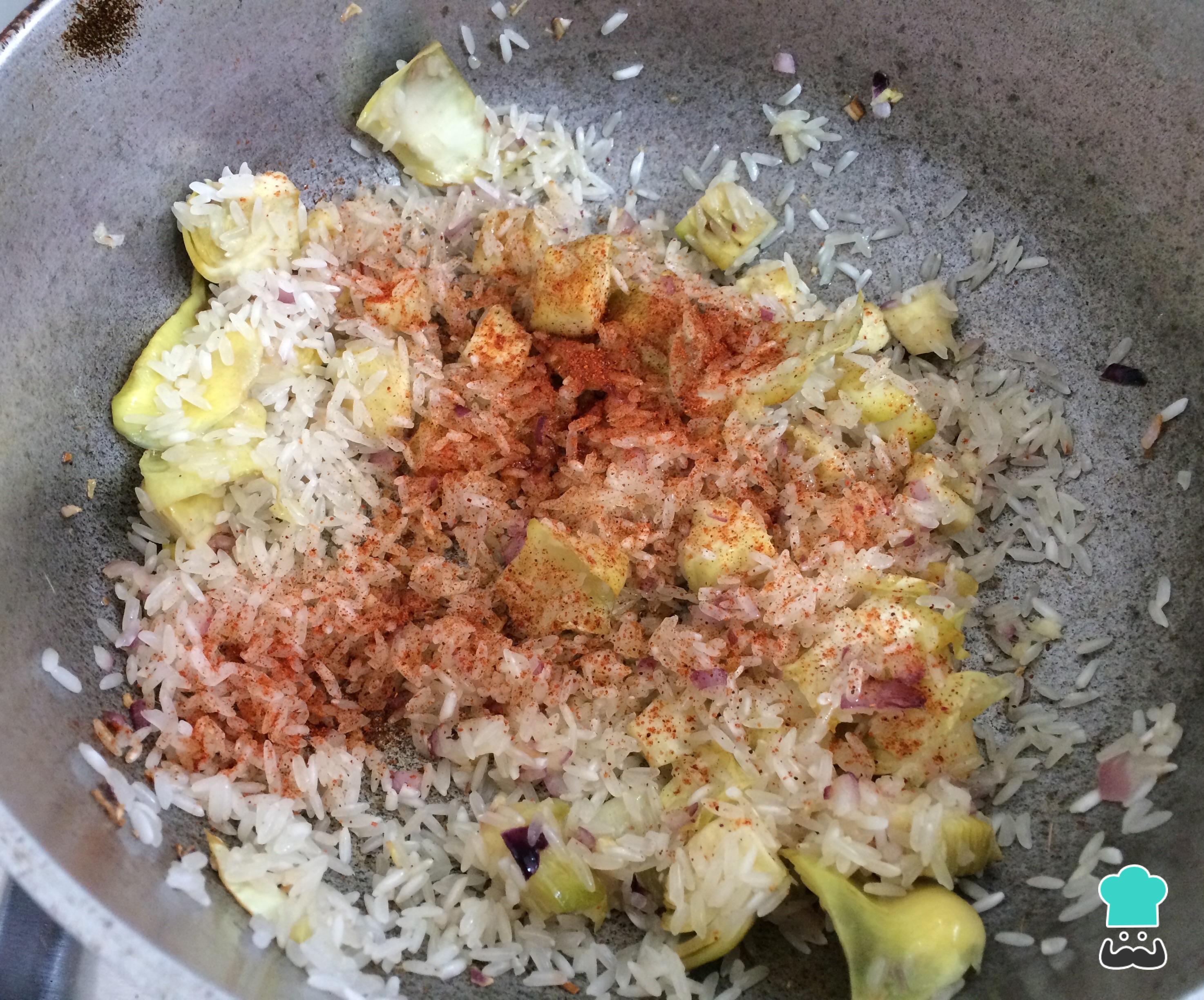 Agregar el arroz y la paprika en polvo, mezclar todo muy bien y saltear durante unos minutos.