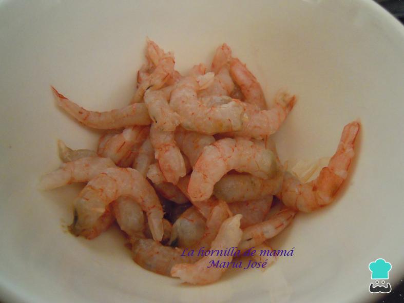 Mientras tanto, pelamos las gambas y le quitamos las cabezas. No tiramos nada. Las gambas las reservamos hasta que haya que ponerlas en el arroz.
