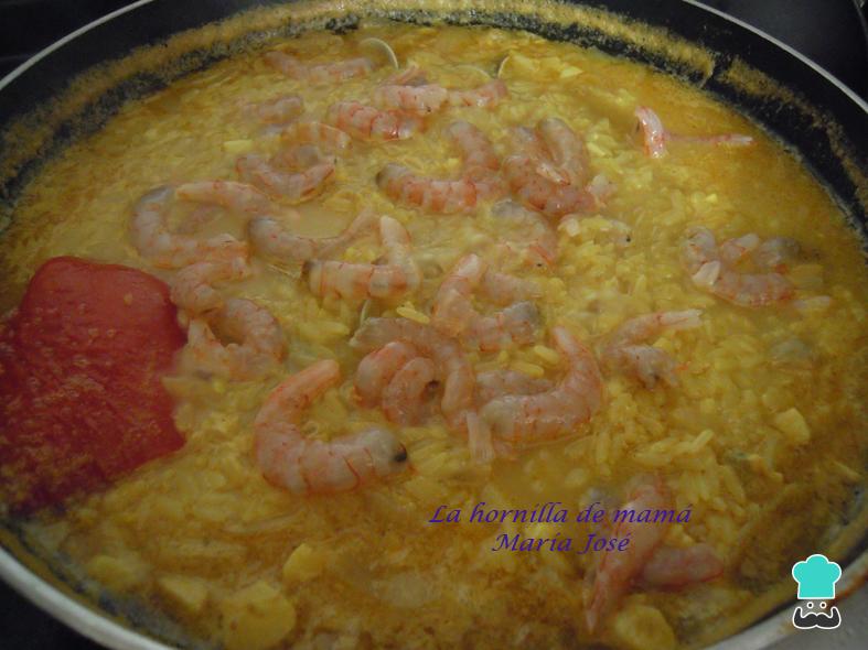 Cuando el arroz esté en su punto agregamos las gambas peladas y dejamos reposar 5 minutos más, en ese tiempo las gambas se harán pero no quedarán duras.