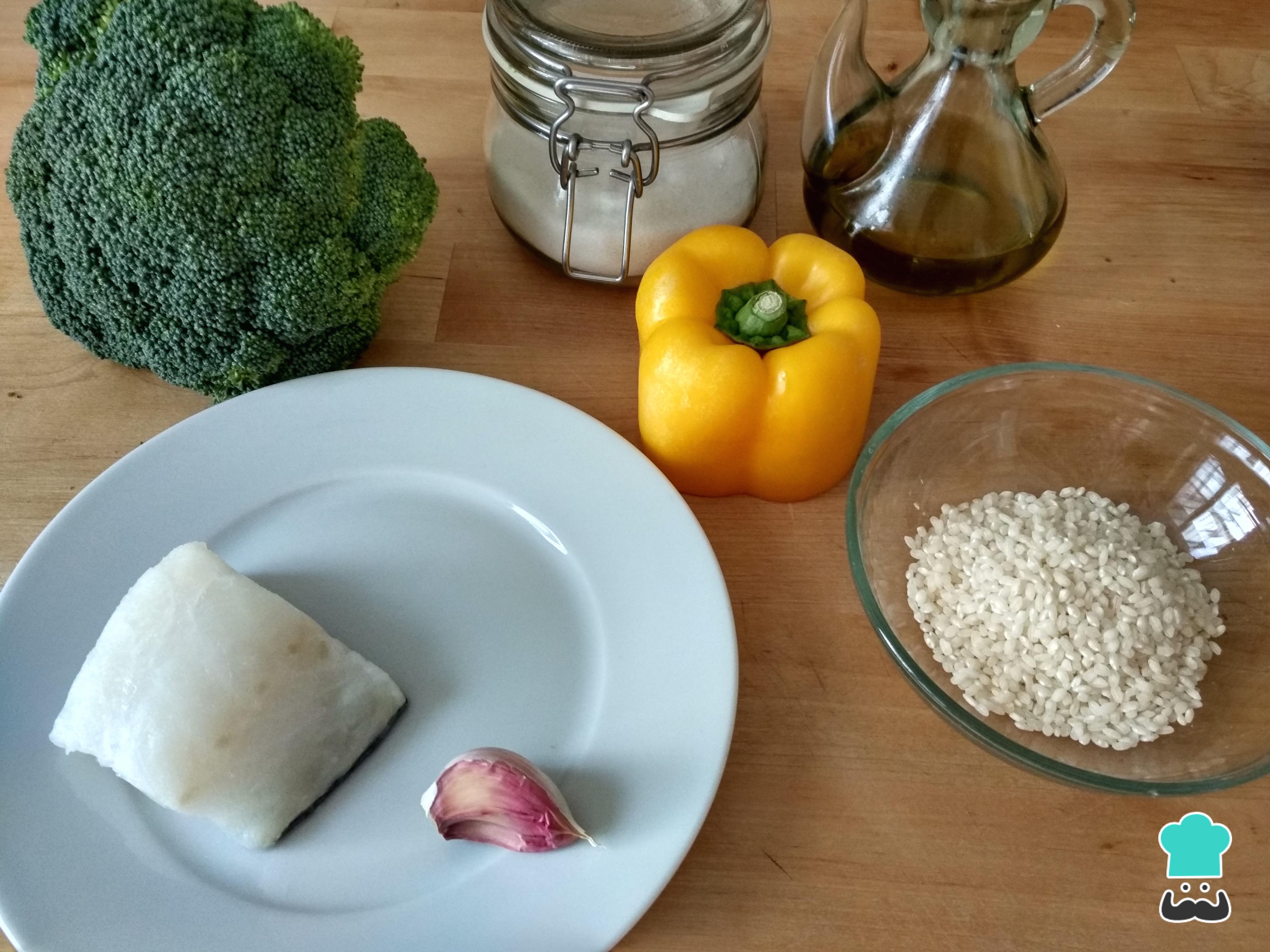 Reunimos todos los ingredientes para elaborar el arroz con brócoli y bacalao.