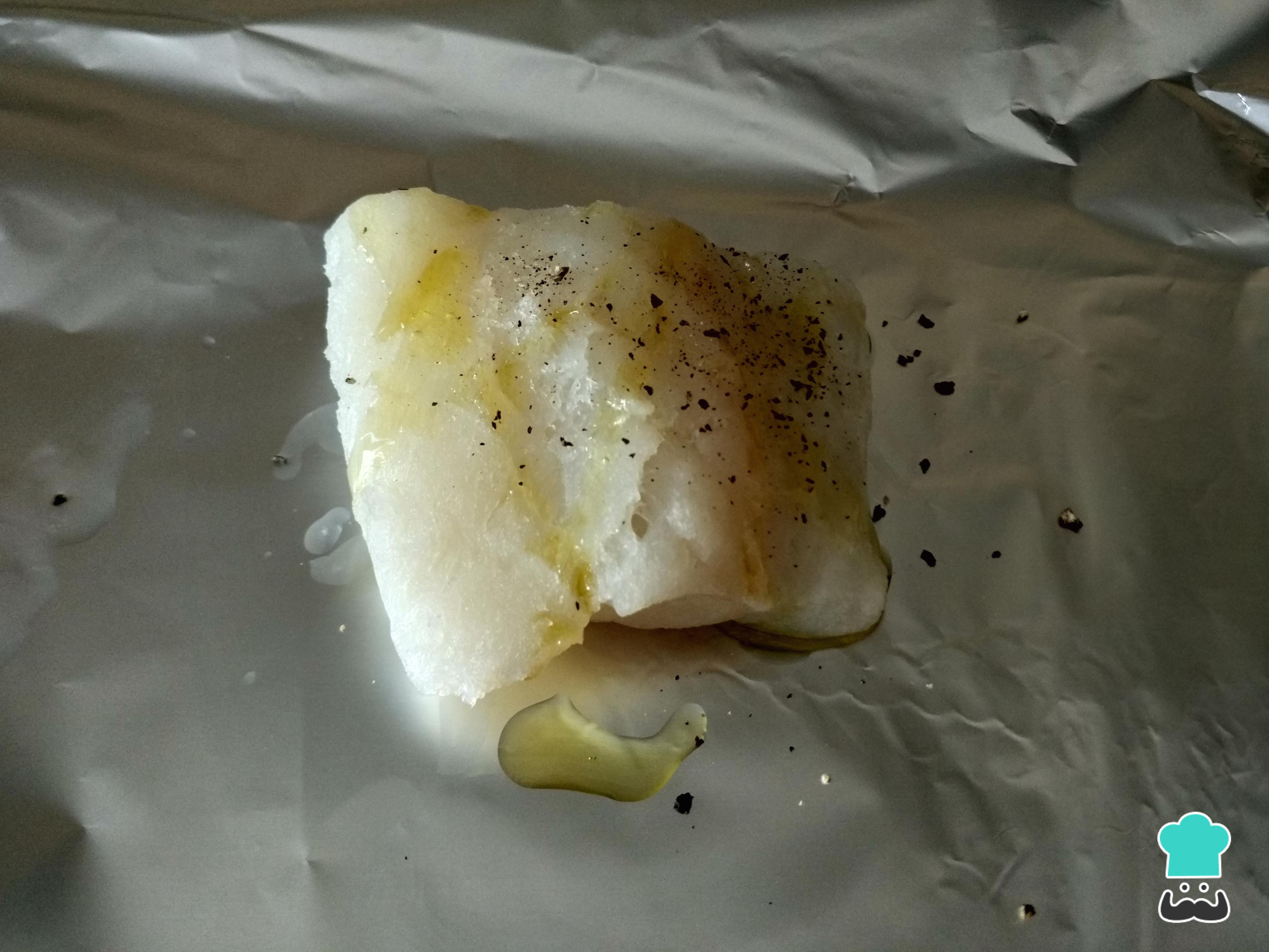 Por otra parte, metemos el bacalao al horno a 180ºC con un poco de pimienta negra molida y aceite de oliva. Hemos horneado el bacalao con la técnica del papillote, envolviéndolo en papel de plata y haciendo un paquetito para que se cueza con sus propios jugos. El tiempo de cocción es de unos 14 minutos.