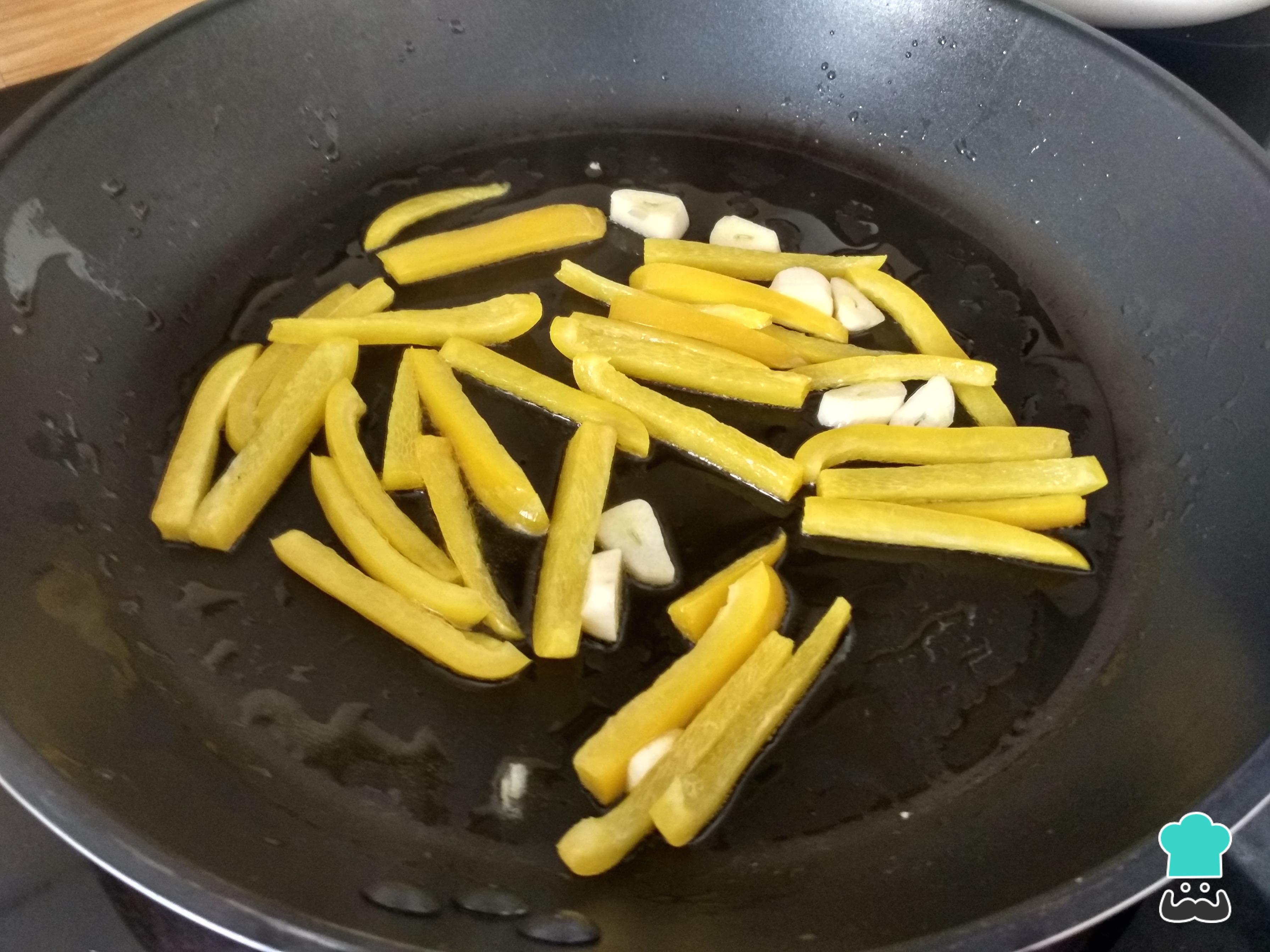 En una sartén, hacemos un sofrito con los ajos fileteados, un poco de aceite y el pimiento amarillo cortado en tiras finas. Dejamos cocinar durante 4 minutos a fuego suave.