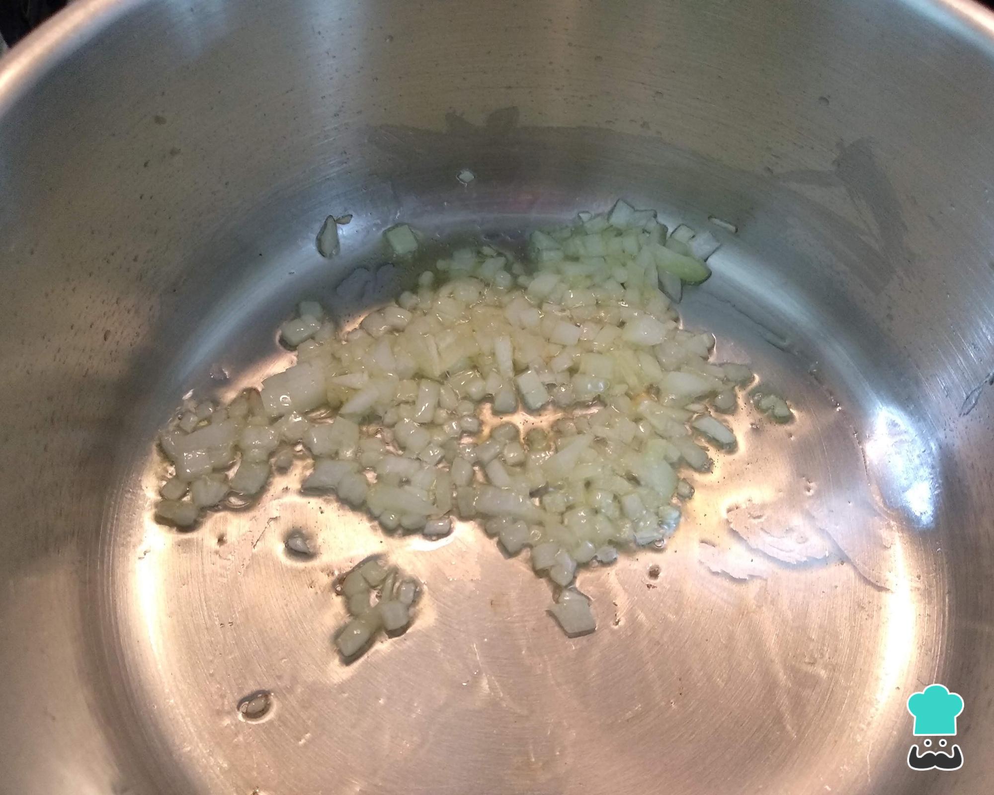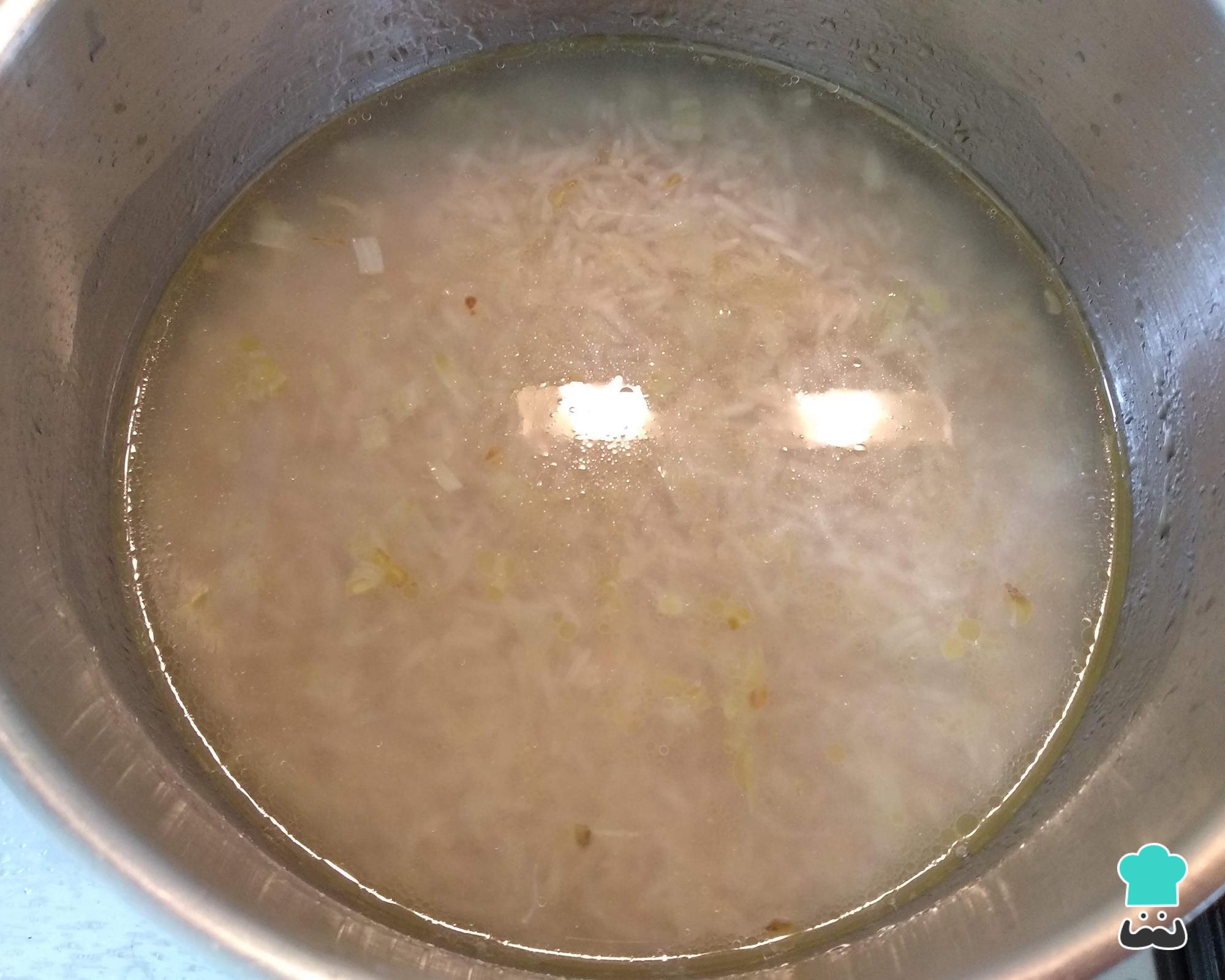 Pasado el tiempo de remojo, pica la cebolla y sofríela en una sartén con aceite caliente. Cuando esté transparente, añade el agua caliente con cuidado y condimenta con sal al gusto. Y si quieres dar todavía más sabor a la receta de arroz con brócoli y pollo, añade un poco de puerro picado.