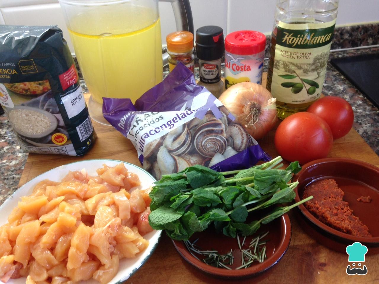 Aquí tenemos los ingredientes para este arroz caldoso con caracoles. Lo más importante es tener muchas especias, a ser posible frescas, para cocer los caracoles y que queden deliciosos.