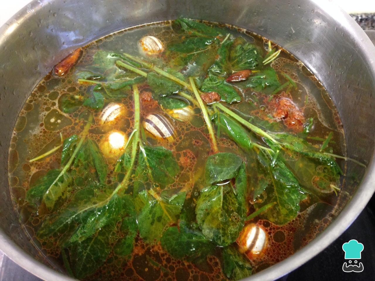 En primer lugar hervimos los caracoles en el caldo de verduras, y añadimos el romero, la hierbabuena y la sobrasada (que es algo picante). De esta forma quedará un caldo realmente sabroso. Estos caracoles congelados necesitarán unos 30 minutos para estar a punto.