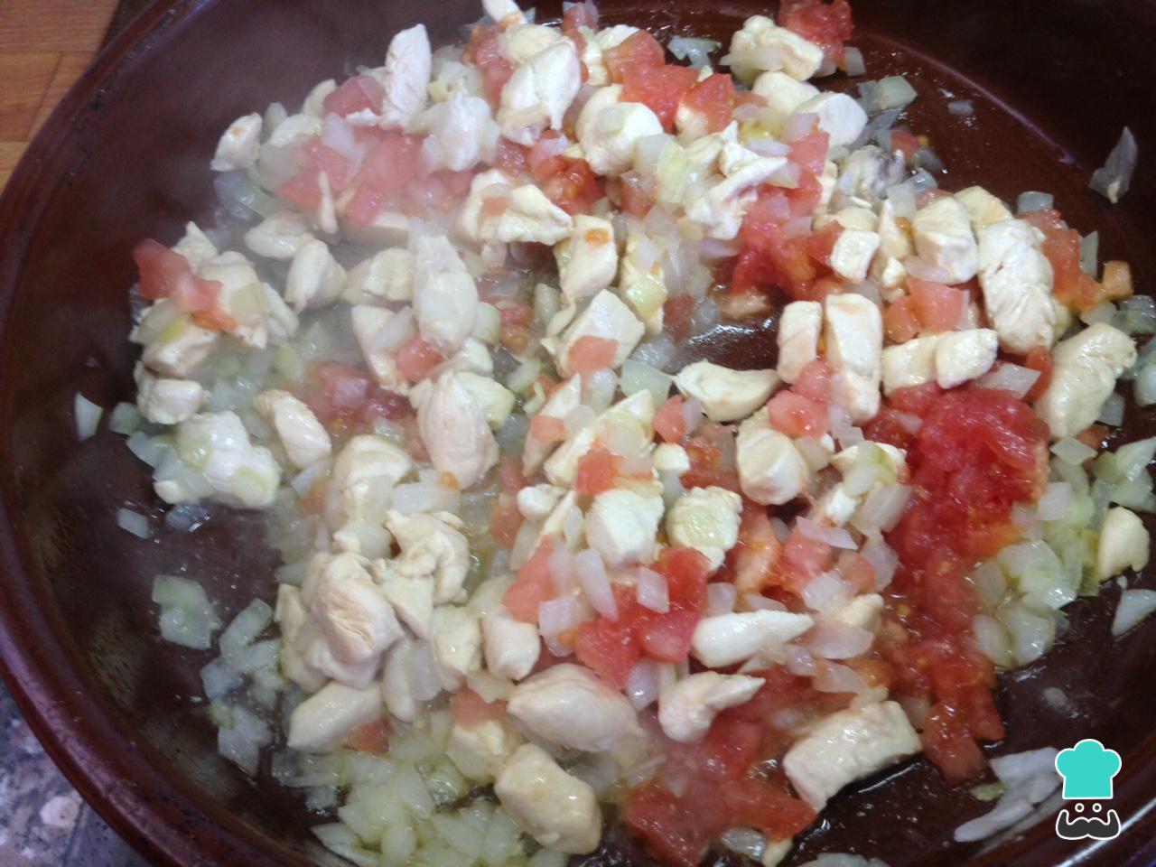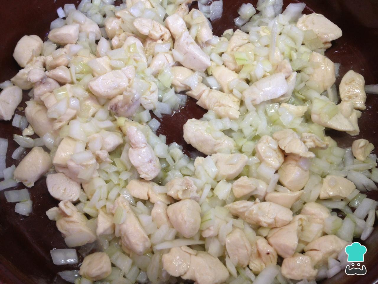 Mientras se cuecen los caracoles, en una cacerola con un poco de aceite ponemos a sofreír la carne de pollo y la cebolla, preferiblemente picada.