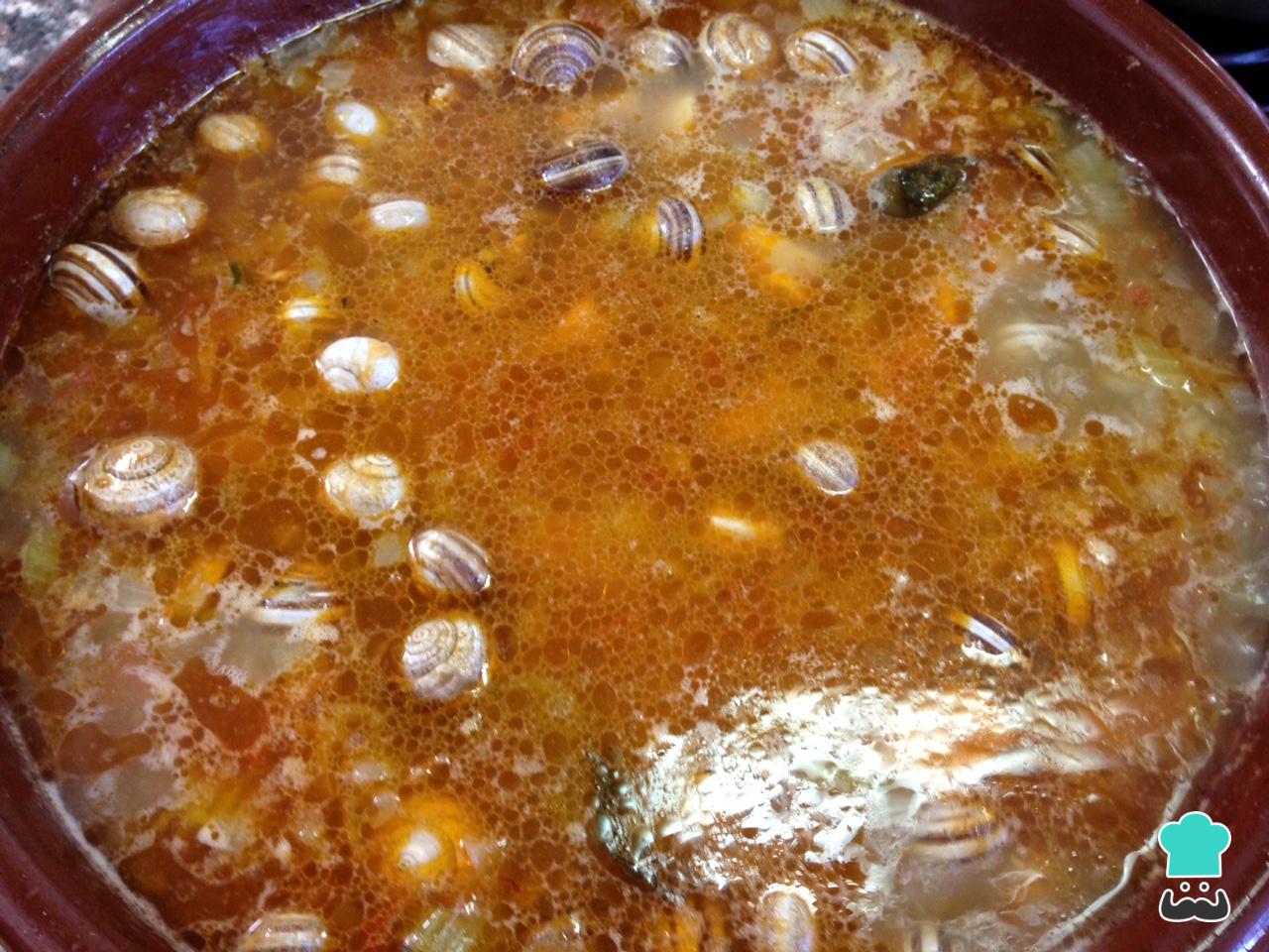 Continuamos la elaboración de nuestra receta española de arroz con caracoles añadiendo los caracoles ya cocidos a la cacerola, junto con el arroz.