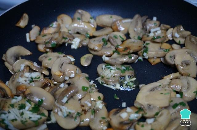 Ponemos una sartén con aceite, salteamos los champiñones laminados y, cuando cojan un poco de color, añadimos el ajo y el perejil, y removemos para que se mezcle todo bien, con cuidado de que no se nos queme el ajo. Sacamos y reservamos.