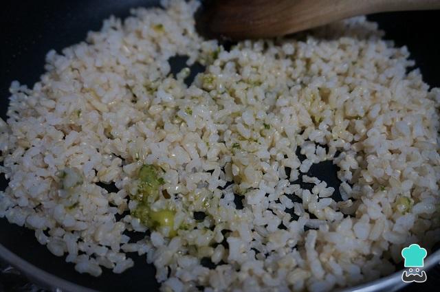Ponemos el arroz en una sartén o cazuela al fuego, añadimos un poquito de aceite, ajo y perejil, y removemos. Probamos de sal.