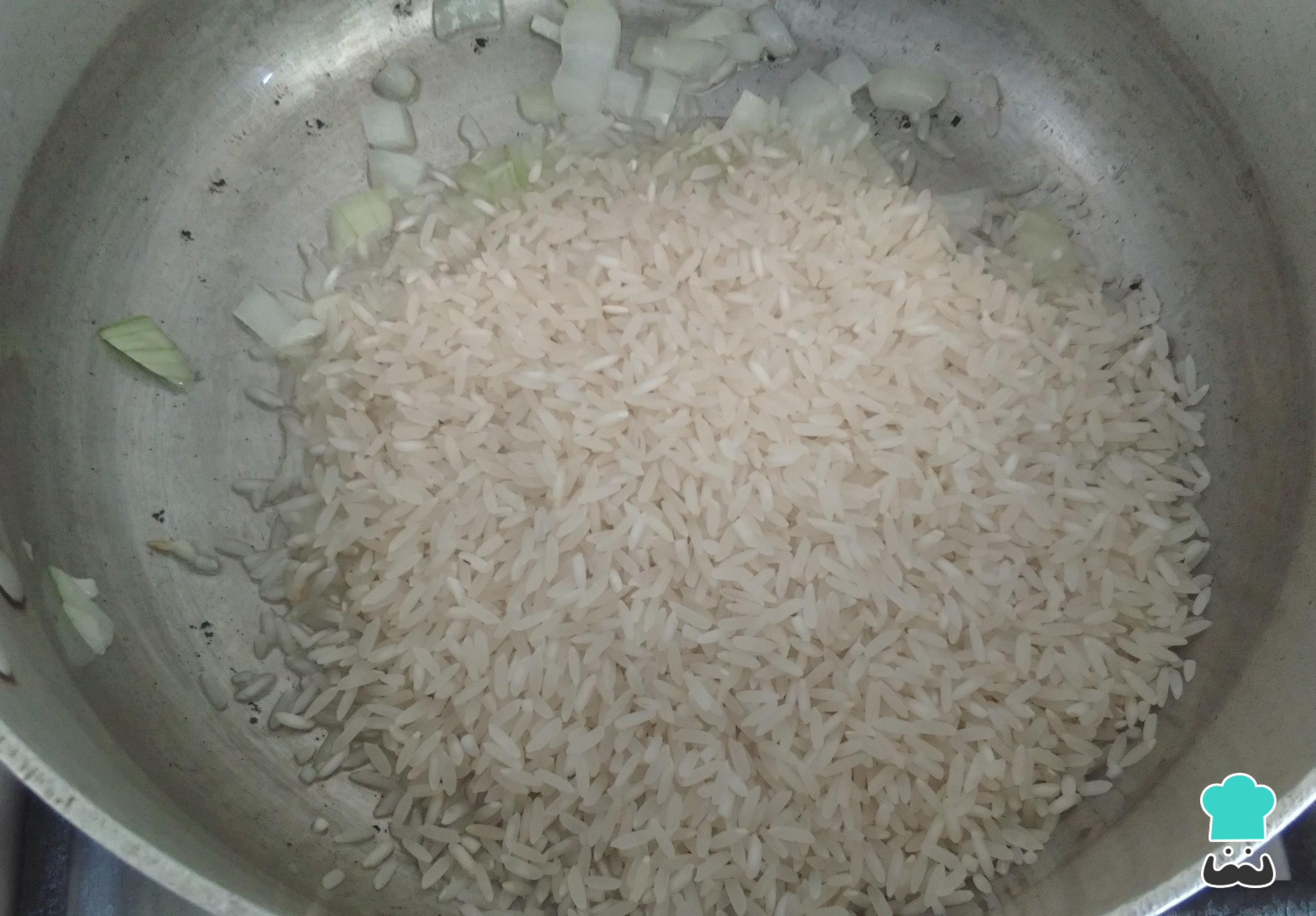 Luego, agrega el arroz y la sal. Esta última a tu gusto. Sofríelo por dos o tres minutos.