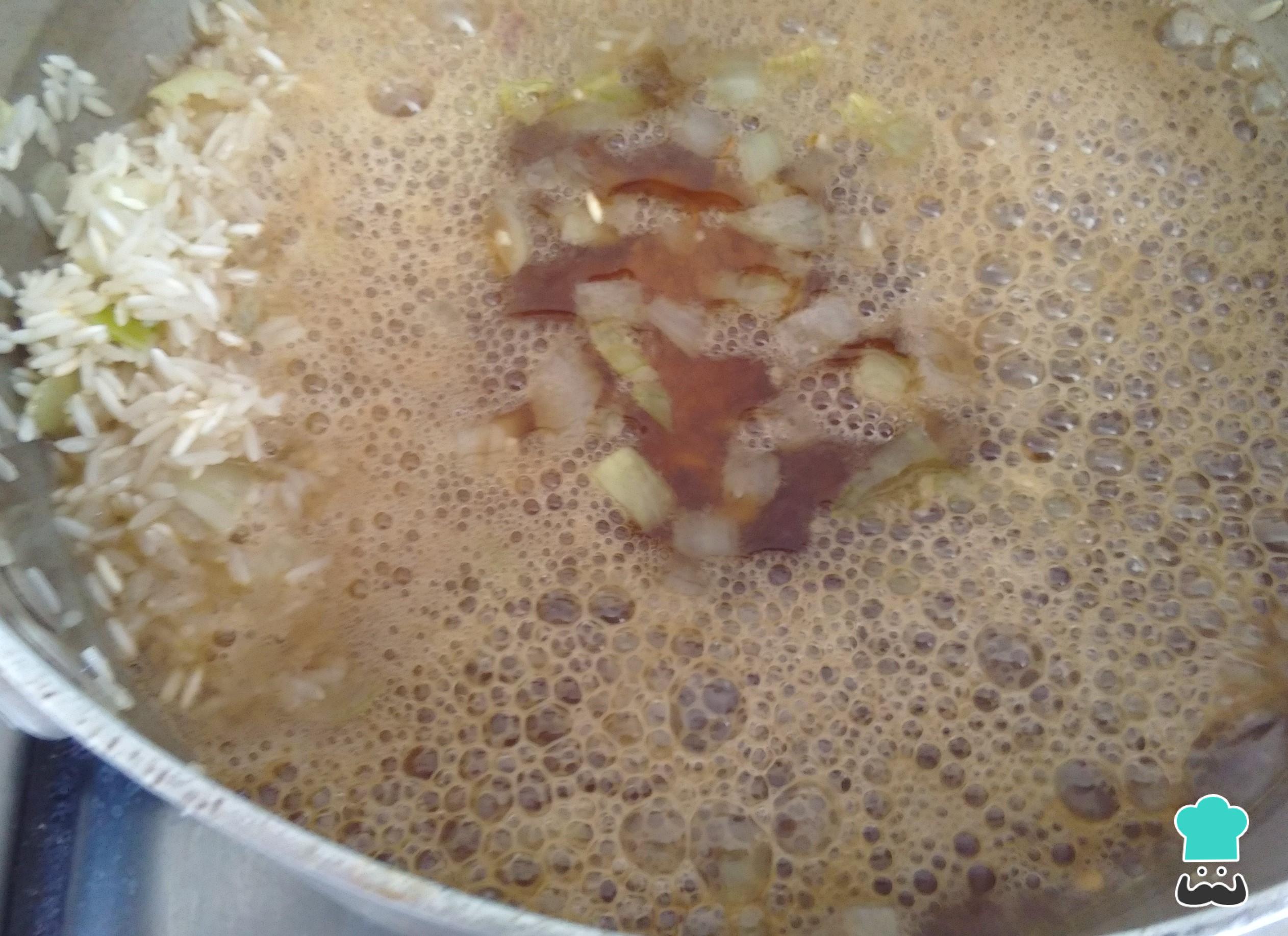 Ahora solo agrega el agua y la gaseosa y revuelve muy bien. Déjalo cocinar como lo haces normalmente, es decir, hasta que el cereal absorba el líquido y quede suelto.