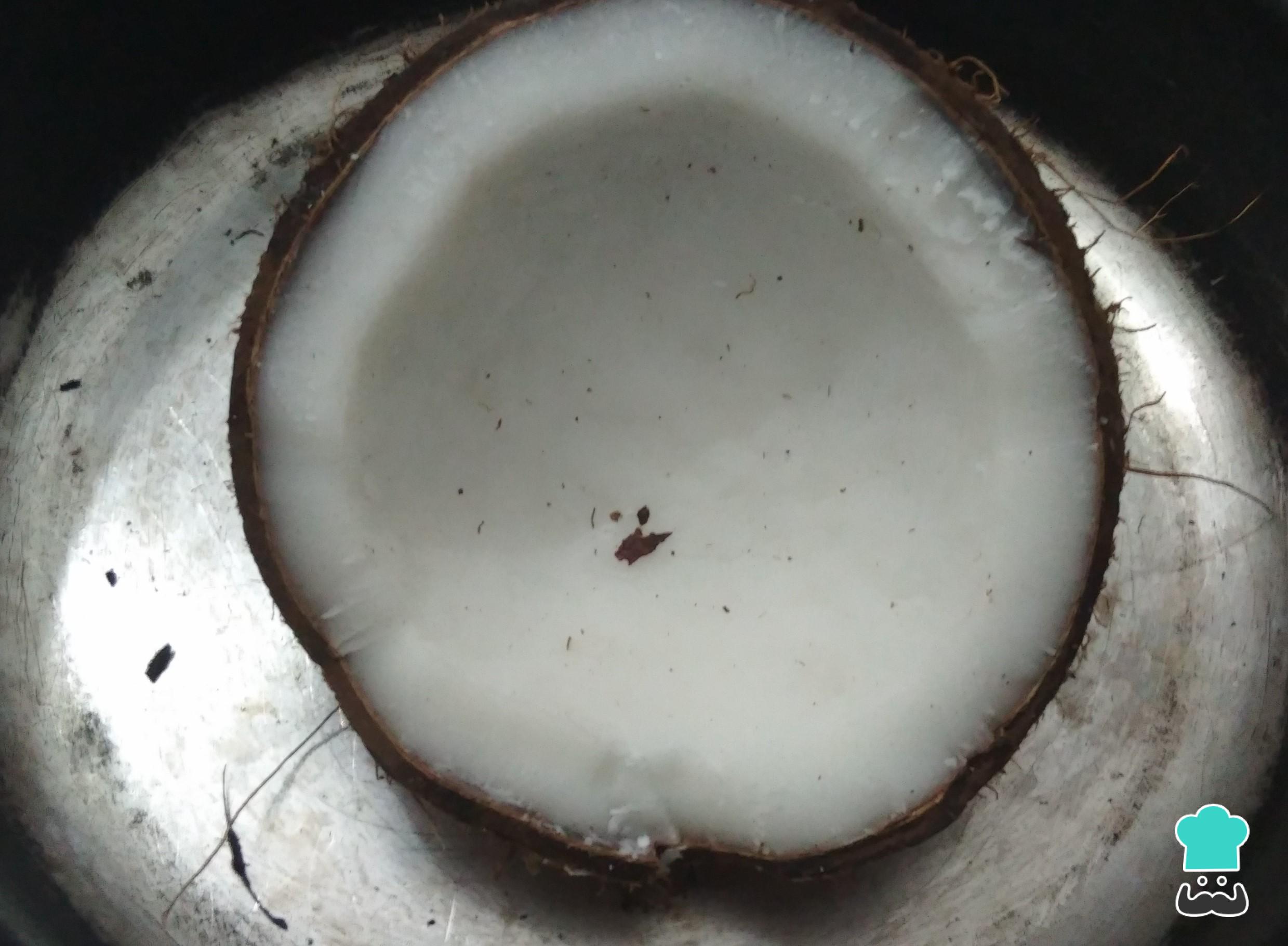 Para comenzar con esta receta de arroz con coco rallado, es necesario separar la carne de la cáscara del coco, colócalo en una sartén caliente. El propósito es que el calor ayude despegarla. Puedes ayudarte con un cuchillo, pero debes tener mucho cuidado.
