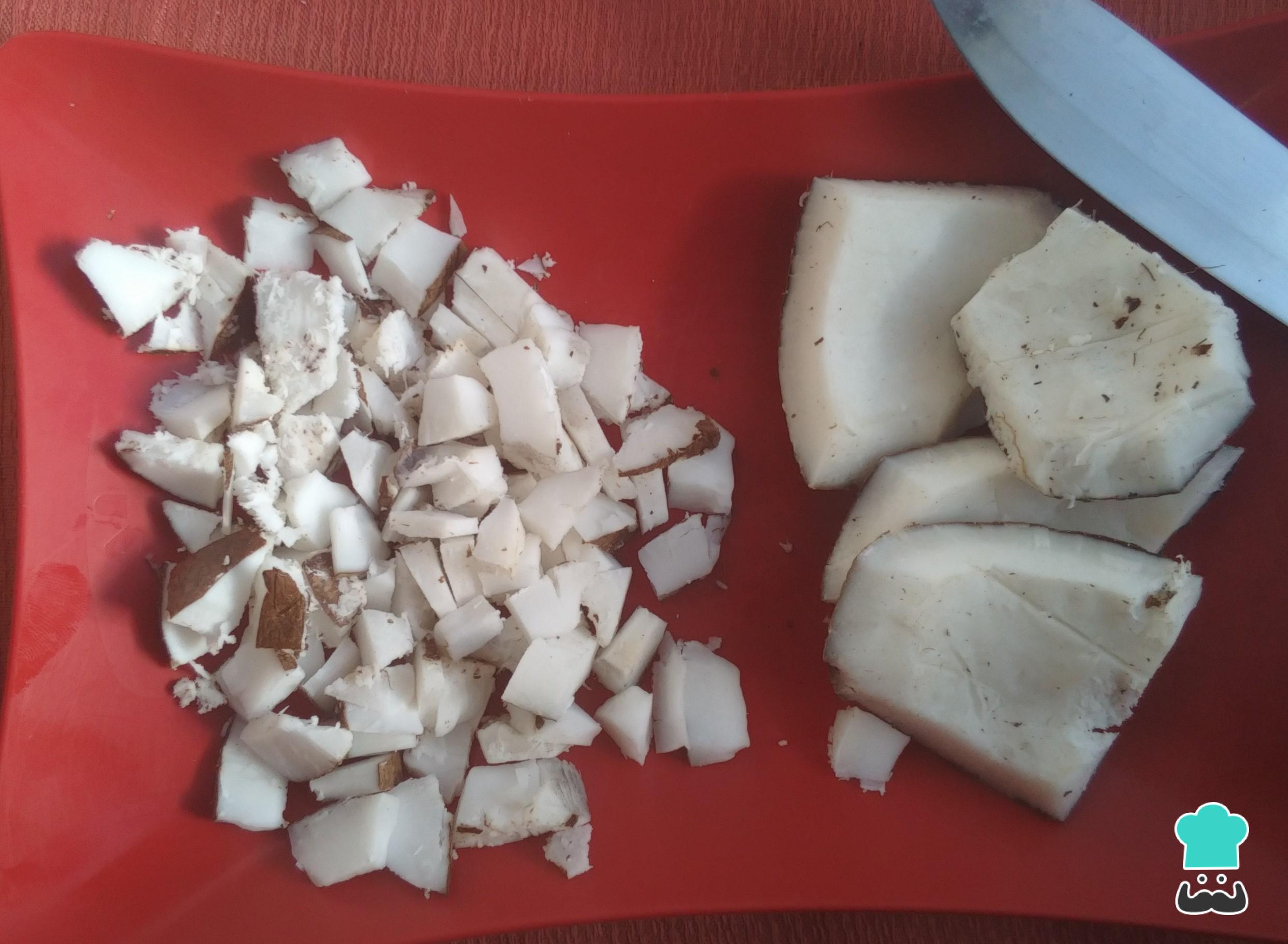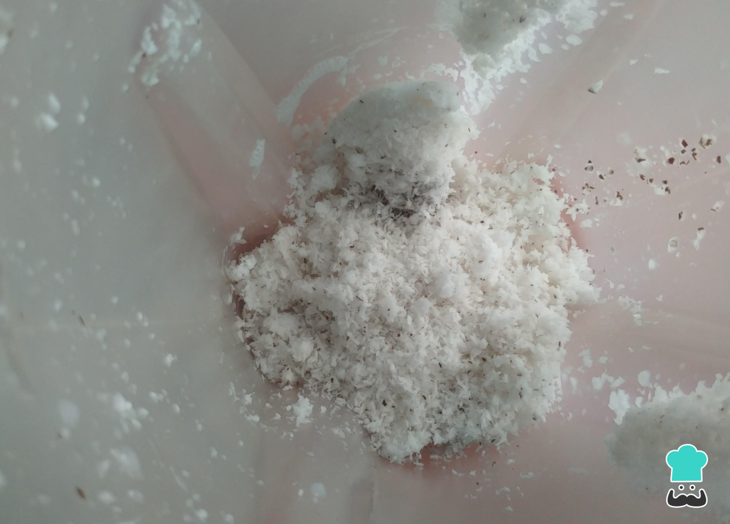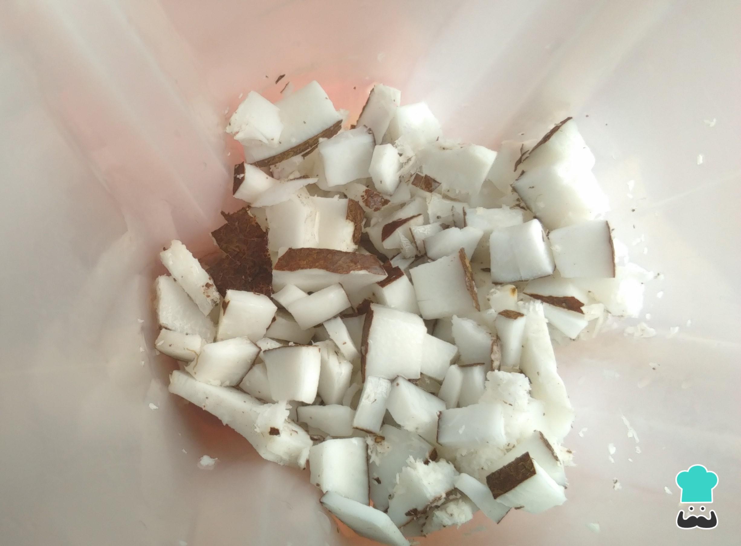 Cuando saques toda la carne del coco, rállalo o pícalo muy finamente. No es necesario que retires la piel oscura que queda pegada de la parte blanca.