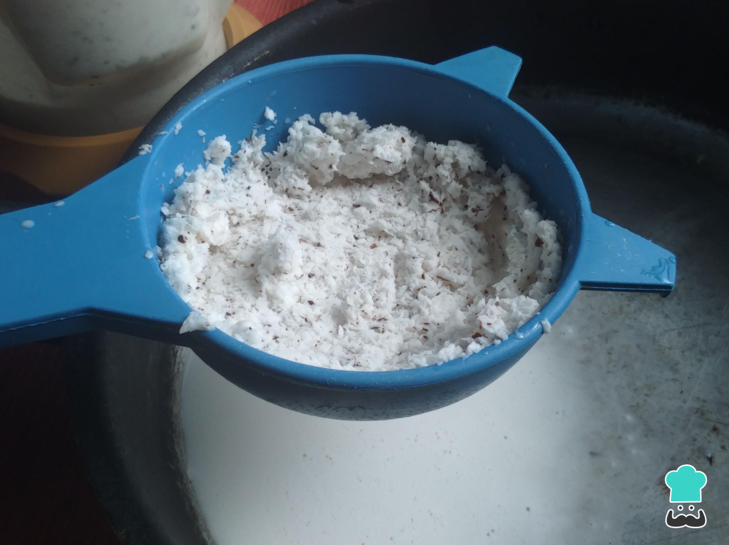 Cuando el coco esté completamente licuado, cuélalo para obtener la leche de coco. No botes la ralladura del coco.