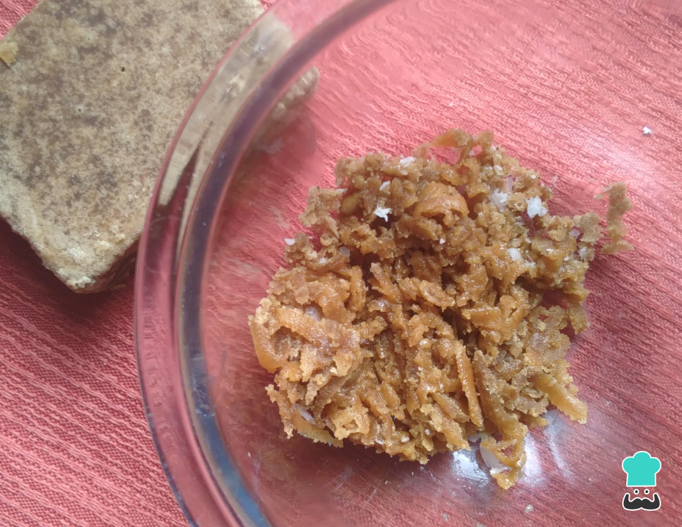 Ralla la panela, piloncillo o papelón. Nosotros usamos este endulzante, pero puedes usar azúcar si lo deseas.