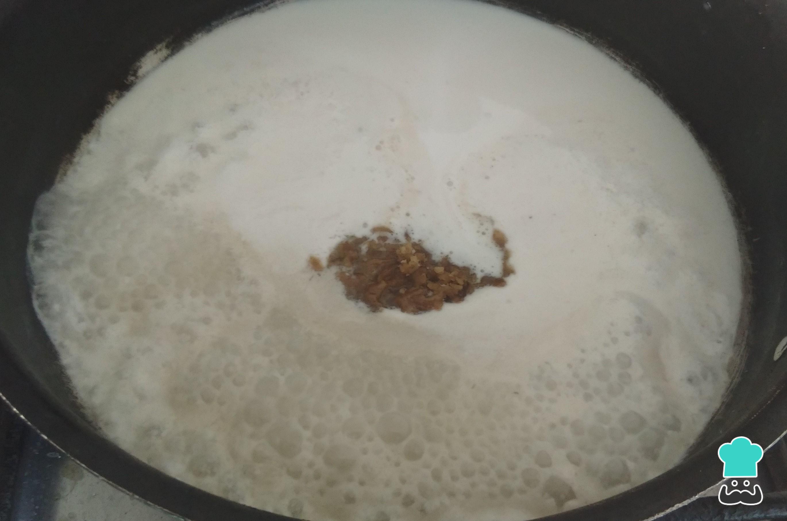 Una vez que tienes la leche de coco, llévala al fuego y agrega la sal y la panela rallada.