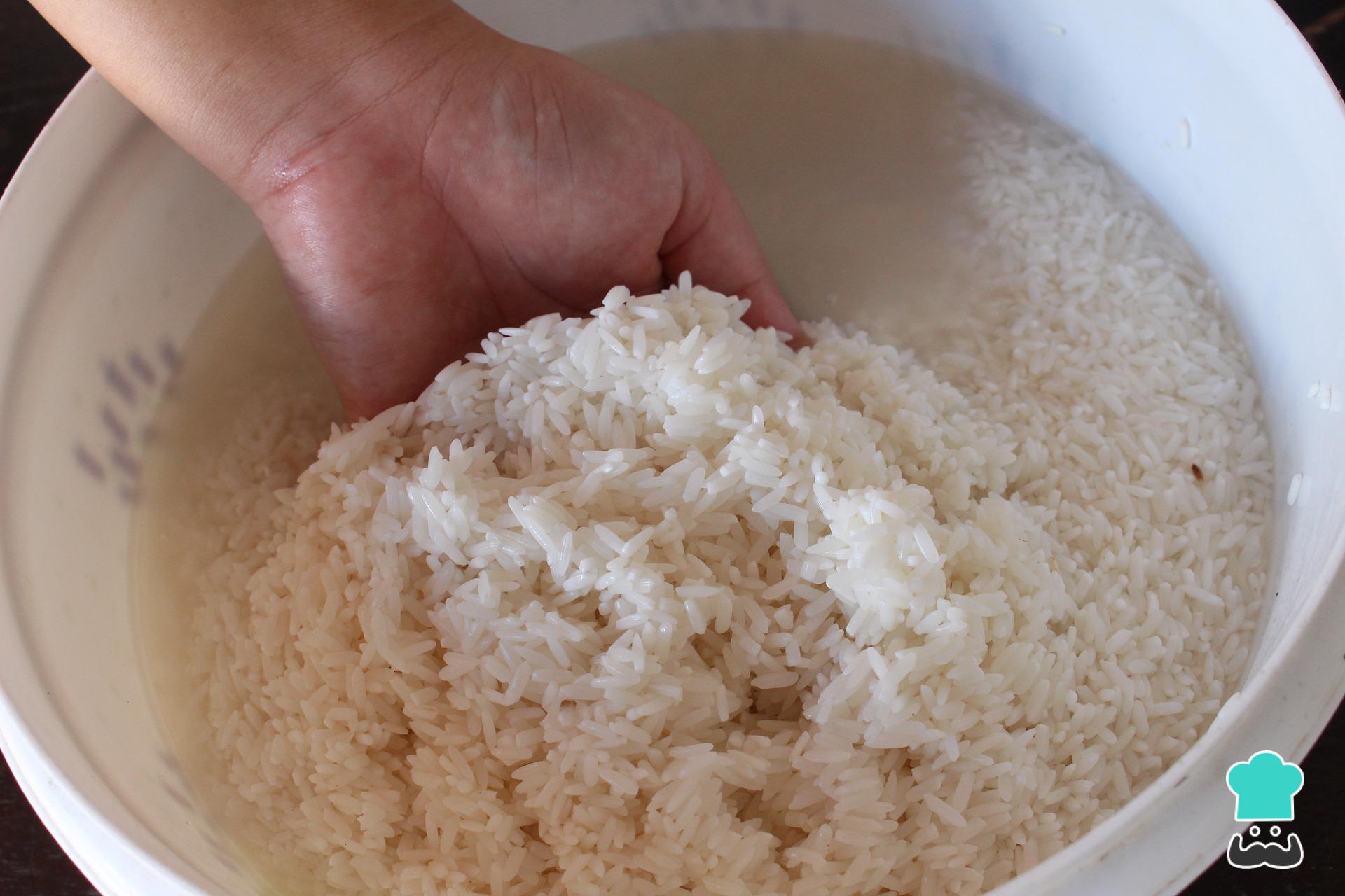 A continuación, ponemos una olla con abundante agua y un chorrito de aceite de oliva al fuego fuerte y la llevamos a ebullición. Cuando empiece a hervir, agregamos el arroz escurrido y cuando empiece a hervir otra vez bajamos el fuego medio-bajo y lo cocemos unos 15 minutos aproximadamente. Una vez cocido, escurrimos bien el arroz, lo lavamos con agua fría y lo reservamos para más tarde.