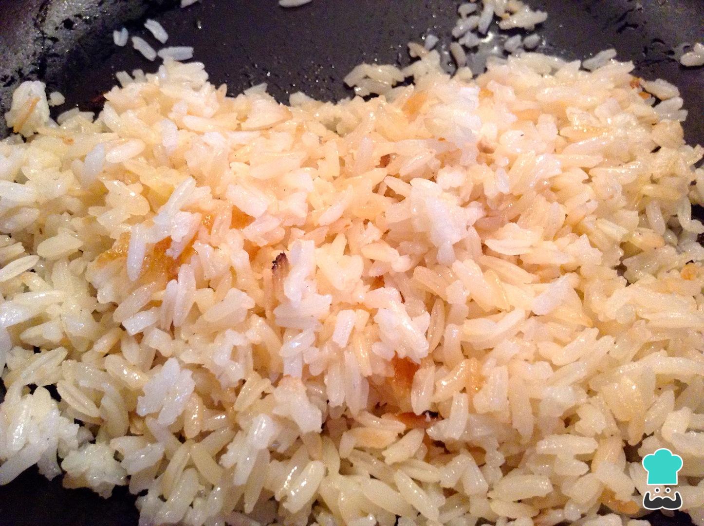 Lleva una sartén a fuego medio con la mantequilla y, una vez esta se derrita, adiciona el arroz blanco que tenemos ya cocinado. Saltea durante algunos minutos.