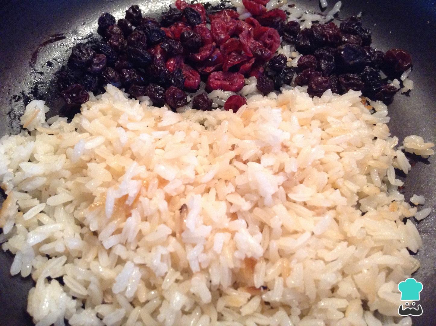 Agrega los arándanos y las uvas pasas (si deseas adicionar algún ingredientes más puedes hacerlo sin problemas). Saltea durante algunos minutos y mezcla muy bien los ingredientes con el arroz blanco para que se distribuyan por toda la preparación.