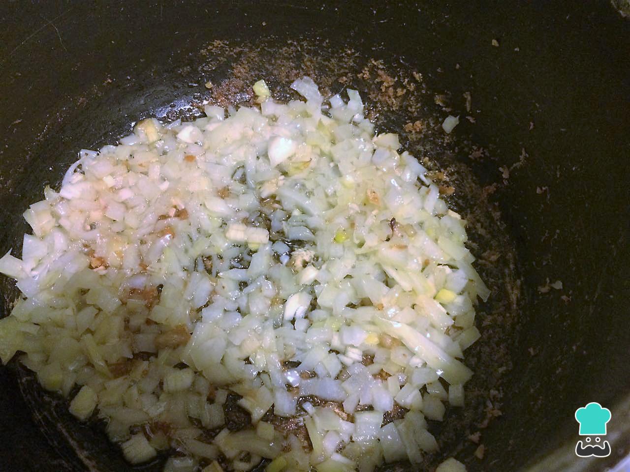 En la misma cacerola y sin lavarla, ponemos a derretir 1 cucharada de manteca con un poco de aceite y rehogamos la cebolla y el ajo. Con una cuchara de madera vamos removiendo el fondo para despegar toda la harina que quedó del pollo, ( en la foto se ve bien en el borde) cuando está transparente así.
