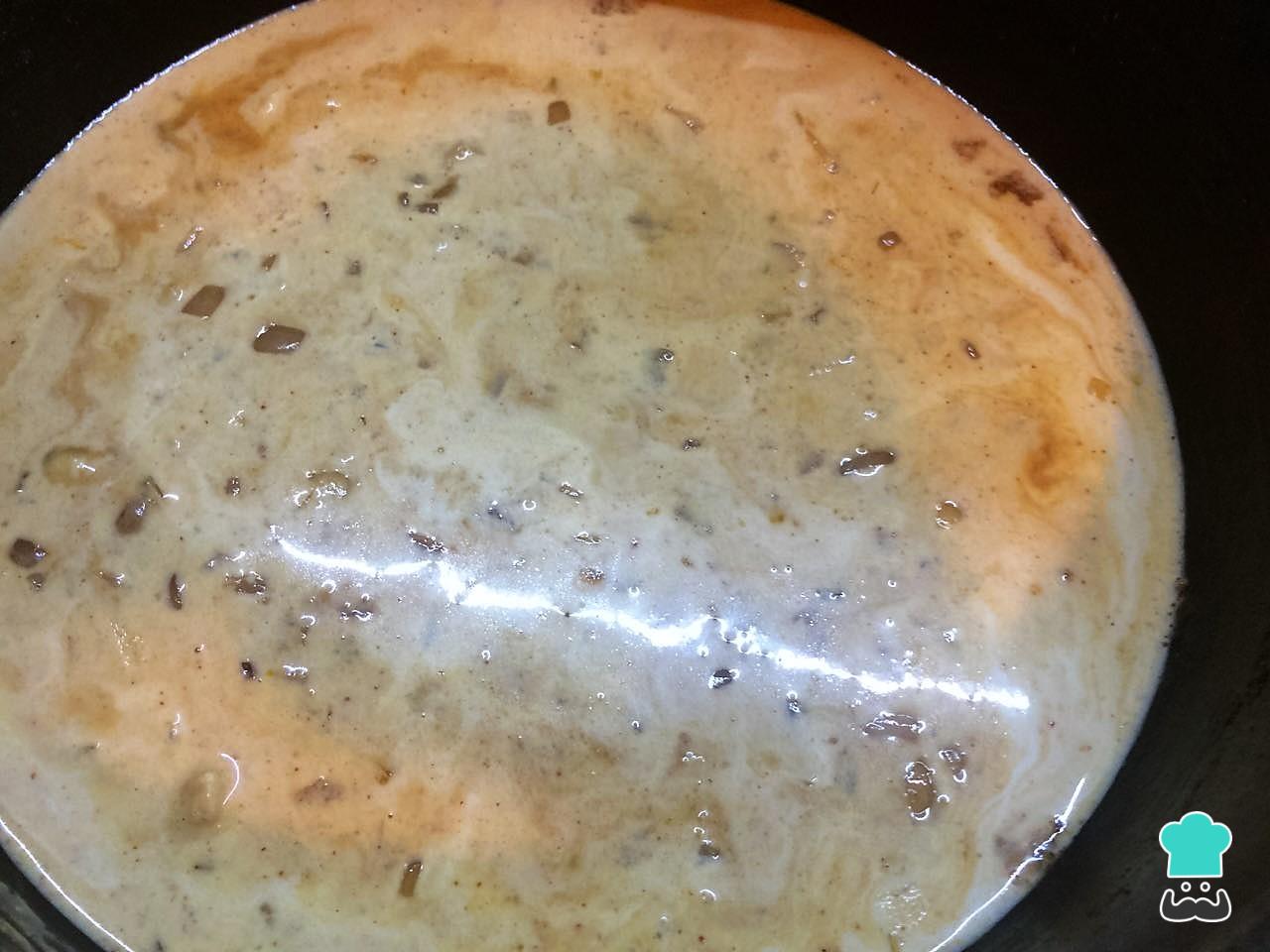 Dejo que se cocine el pollo a fuego bajo y destapado hasta que empieza a espesar. Entonces le incorporo la crema y dejo que vuelva a hervir. Así el pollo a la crema con arroz estará más sabroso.