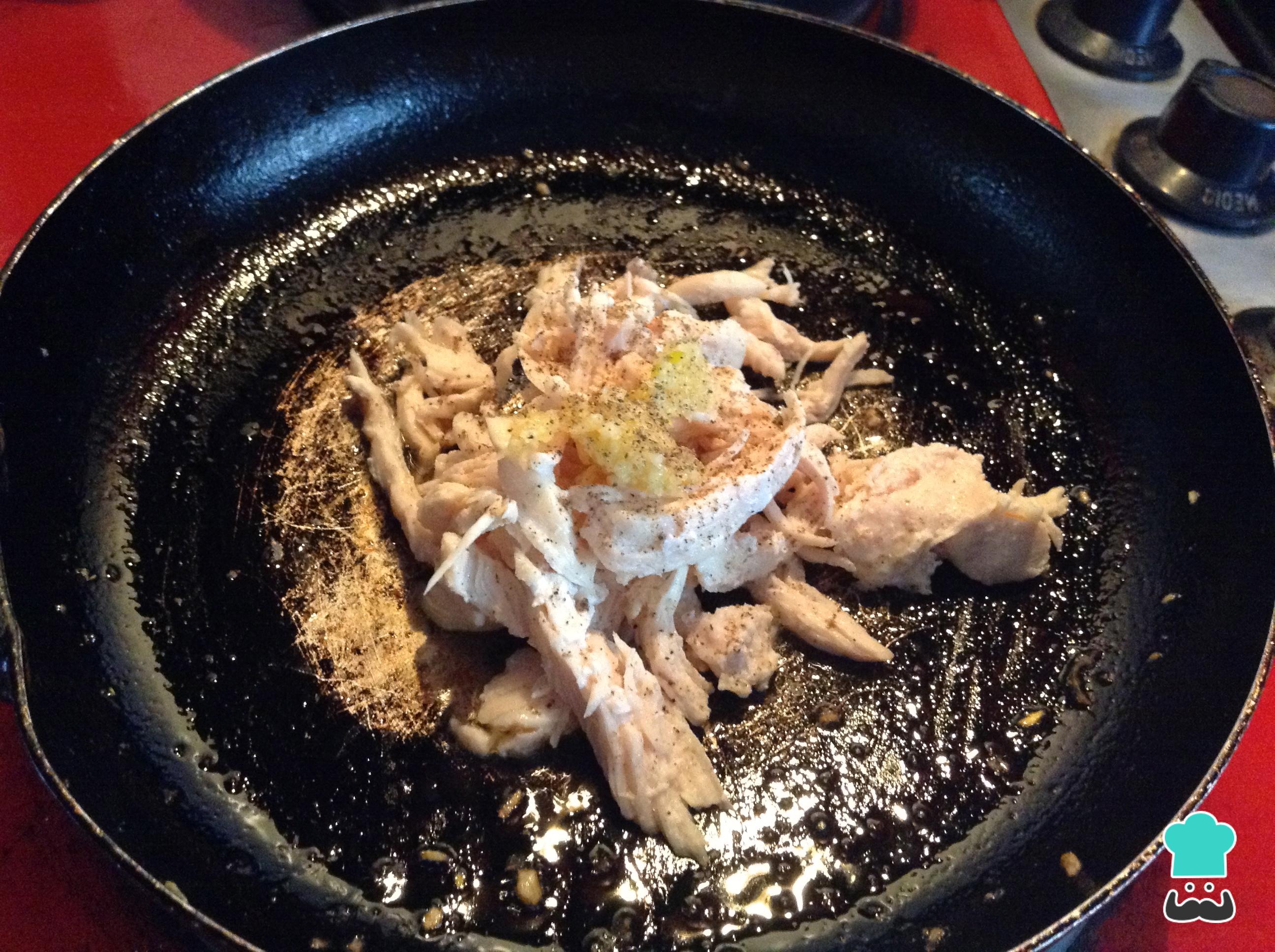 Llevar una sartén a fuego medio con un poco de aceite, adicionar nuestro pollo desmechado con un poco de ajo, pimienta y sal. La cantidad de pasta de ajo puede ser a gusto.