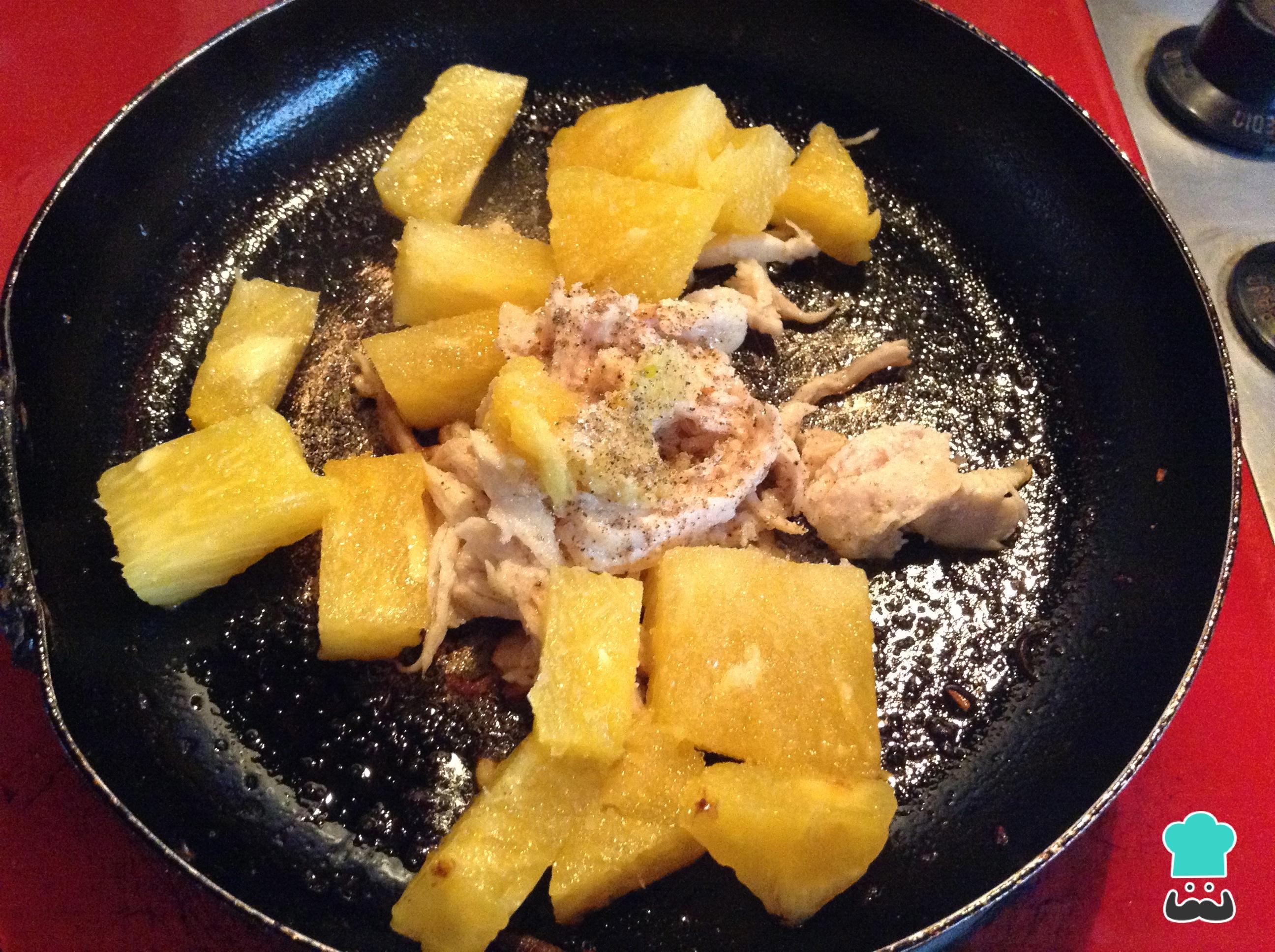 Adicionar la piña cortada en cuadros y sofreír con un poco de azúcar espolvoreada encima para dar un toque agridulce a la preparación.